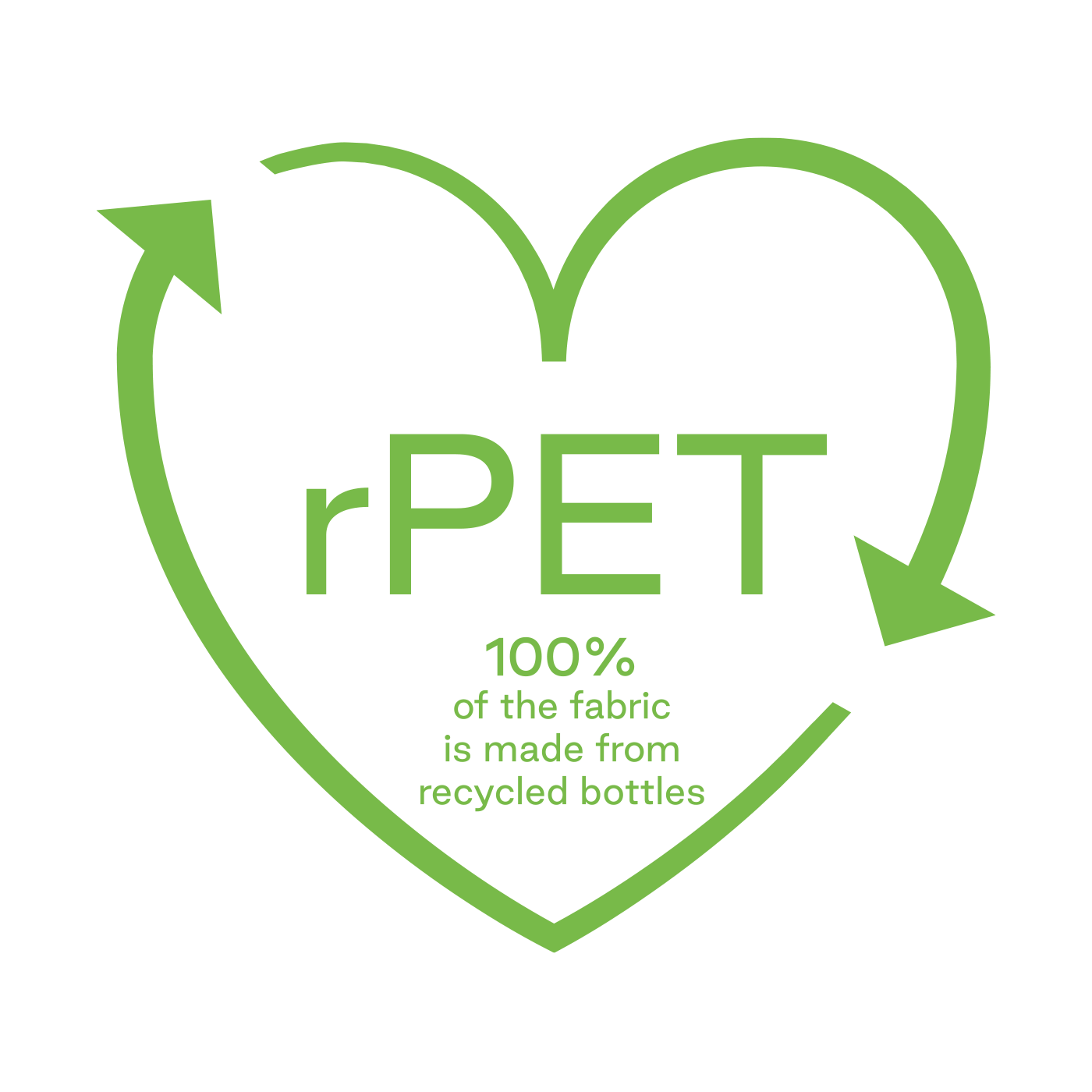 Il 100% del tessuto è realizzato con 48 bottiglie di plastica riciclate (bottiglie rPET).