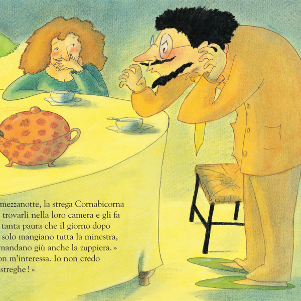 Il piccolo Pietro non ne vuole sapere di mangiare la minestra. Fa i capricci con la mamma, la nonna, il nonno e persino con il papà. «Nooo, non voglio!» strilla invariabilmente. Nemmeno agitare la minaccia della strega Cornabicorna, che arriva sempre a spaventare i bambini capricciosi, funziona con Pietro, che si ritrova a letto con la pancia vuota. «Io non credo alle streghe» dice. Eppure, quella notte, la strega Cornabicorna salta fuori dall’armadio con un orribile cigolio… Quello che succederà dopo lascerà tutti quanti di stucco. Soprattutto la strega!