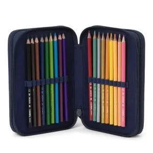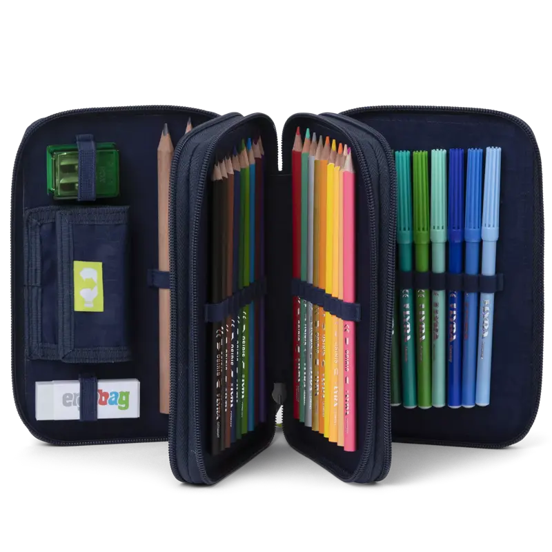 Risparmia spazio e organizza i tuoi strumenti di scrittura con l'astuccio Ergobag Maxi a 3 scomparti! Puoi facilmente trovare e selezionare la tua matita o penna preferita grazie alla sua capacità di 40 pezzi. I tre scomparti separati contengono 18 matite colorate e 18 pennarelli, rendendolo perfetto per l'uso a scuola.