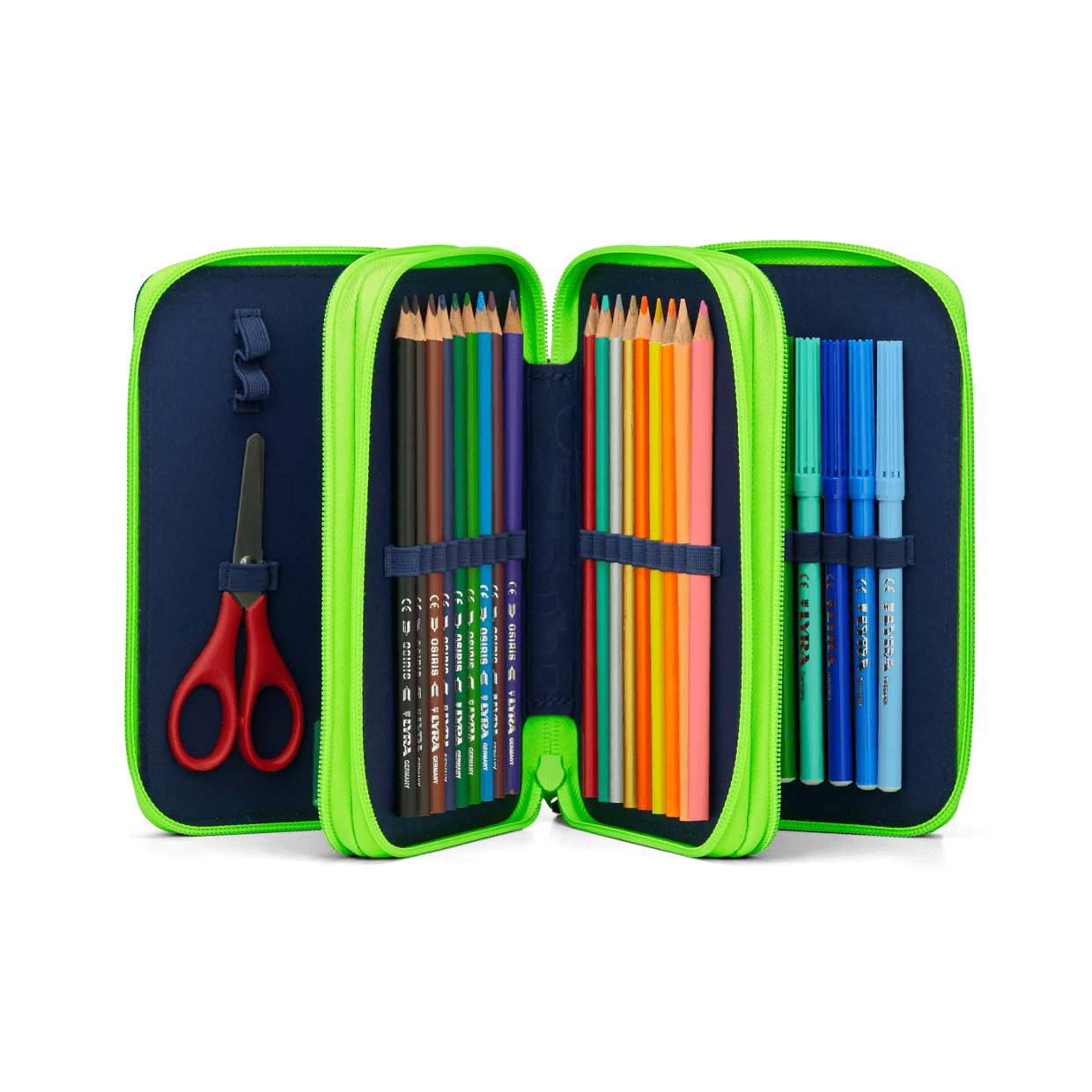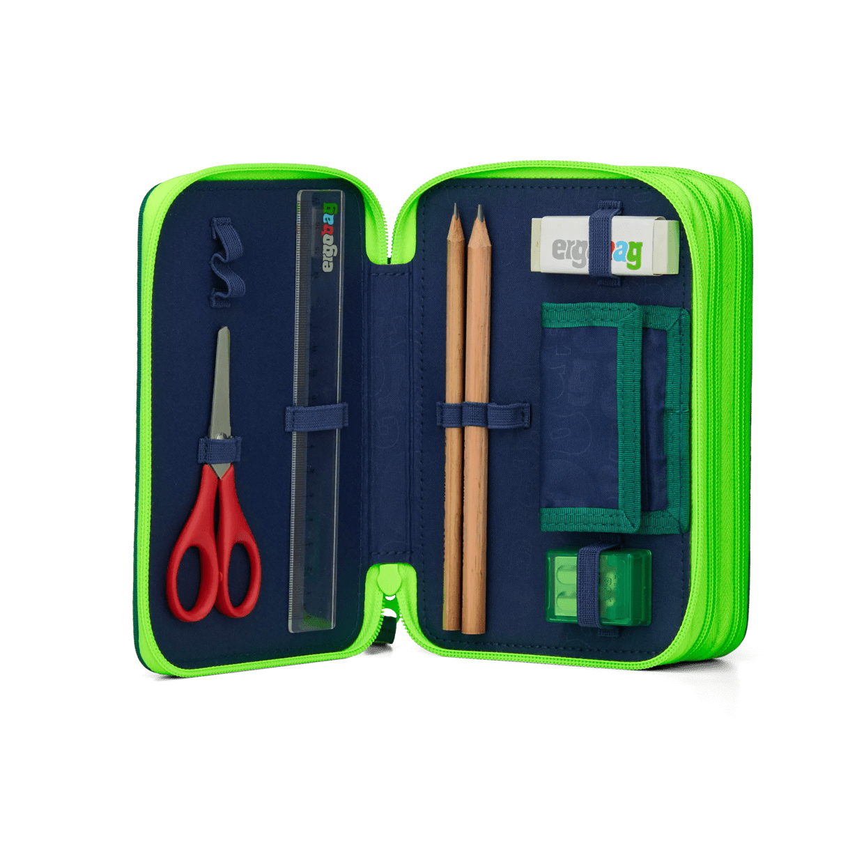 Risparmia spazio e organizza i tuoi strumenti di scrittura con l'astuccio Ergobag Maxi a 3 scomparti! Puoi facilmente trovare e selezionare la tua matita o penna preferita grazie alla sua capacità di 40 pezzi. I tre scomparti separati contengono 18 matite colorate e 18 pennarelli, rendendolo perfetto per l'uso a scuola.