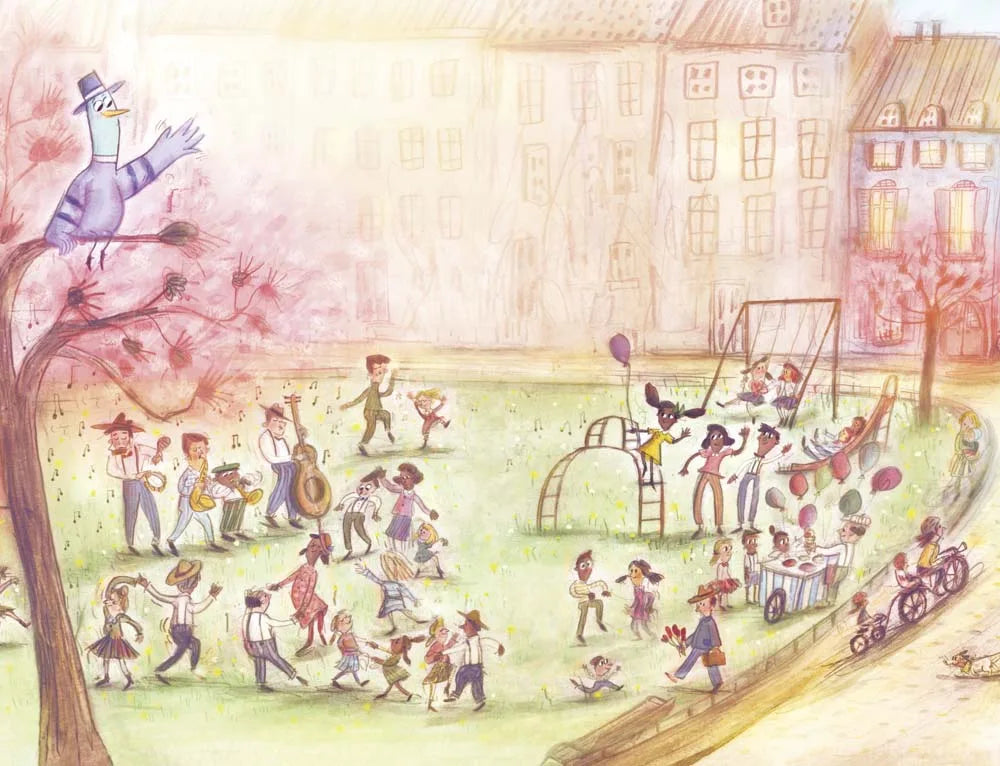 Hugo il piccione ha un lavoro importante. Si prende cura del parco e di chi lo frequenta. In pratica di tutti quelli che abitano intorno al parco. Tutti tranne una bambina le cui tende non sono mai aperte, una bambina che non esce mai a giocare. Ma un giorno Hugo è così impegnato a fare il suo balletto della felicità per la bimba che non vede un cane arrivare di corsa… qualcuno deve correre a salvarlo!