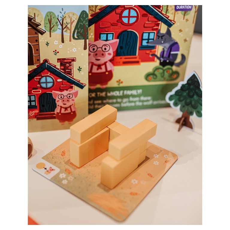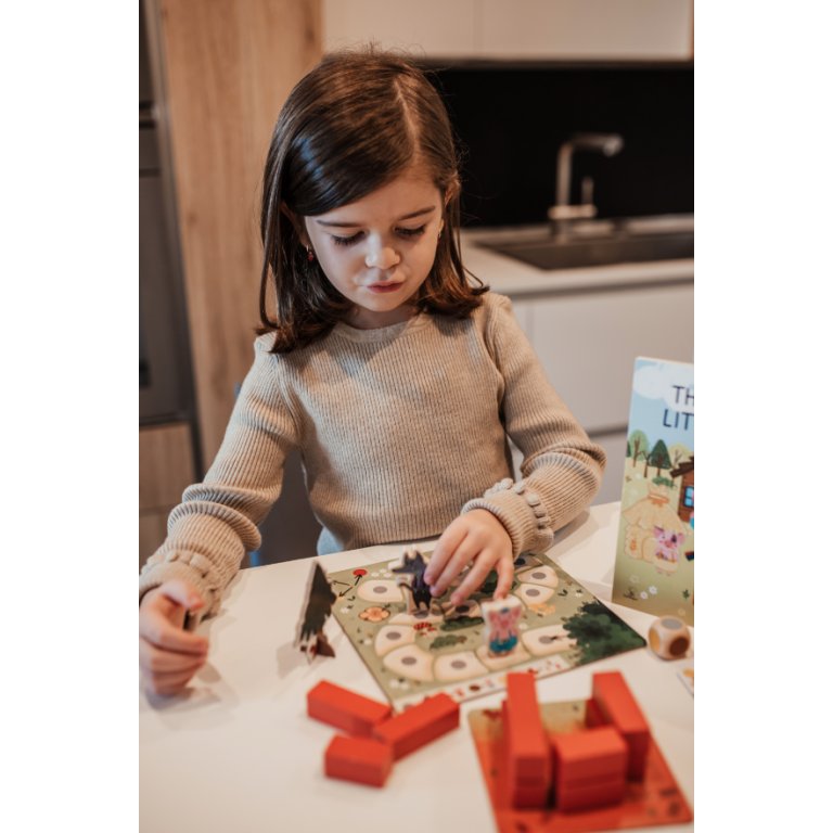 Im Inneren finden Sie: ein illustriertes Spielbrett für 2 Spielvarianten, 4 Holzfiguren mit den Protagonisten der Geschichte, alle Materialien zum Bau der 3 Häuser und einen großen, leicht zu handhabenden Holzwürfel.