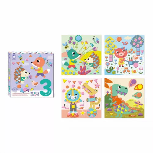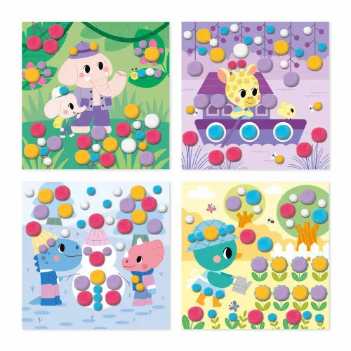 Bereits im Alter von 3 Jahren können Kinder damit beginnen, erste künstlerische Arbeiten zu erschaffen, zum Beispiel Pompons zu kleben! Eine einfache, aber unterhaltsame Aktivität, die die Kleinen an kreative handwerkliche Tätigkeiten heranführt. Dieses Set enthält 4 Quadrate zum Dekorieren mit 150 Pompons in 2 Größen und 5 verschiedenen Farben. Im Lieferumfang sind außerdem 4 Halterungen für die Quadrate, die mit der Box hergestellt werden, sowie 150 Pompons in 2 Größen und 5 verschiedenen Farben enthalten. Die Anleitung und die farbigen Umrisse der Formen auf den Quadraten helfen den Kindern dabei, die Pompons in der richtigen Farbe und Größe an die richtige Stelle zu kleben. Darüber hinaus lässt sich die Box in eine Staffelei verwandeln, um Kunstwerke auszustellen. Die Erstellung eines Bildes dauert etwa 20 Minuten. Dieses Kunstset ist Teil der My Arts & Crafts-Kollektion, einer Reihe kreativer Aktivitäten für die Kleinen mit niedlichen pastellfarbenen Tieren.