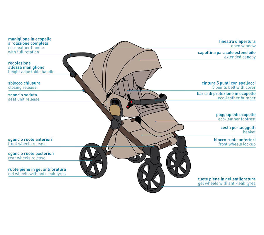 - Kinderwagen (6-36 Monate, bis 15 kg) mit vorwärts- und elternseitigem Sitz, inklusive Reduzierstück, Sicherheitsgurt einstellbare Sicherheit und Sturzbügel. Rückenlehne und Fußstütze lassen sich in verschiedene Positionen verstellen.