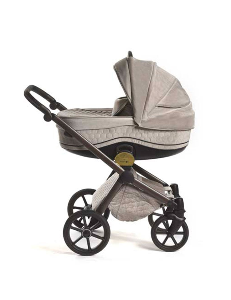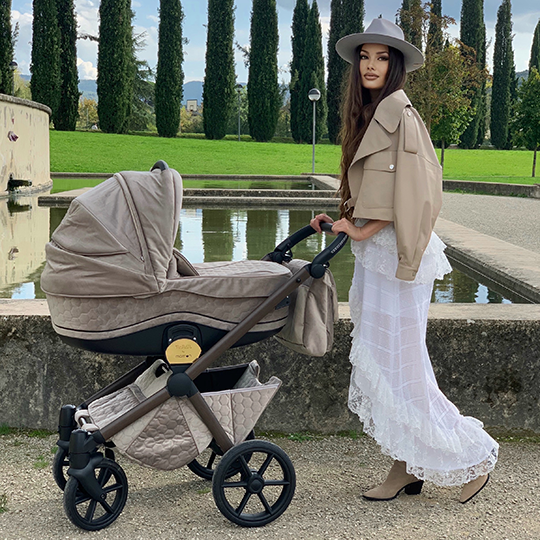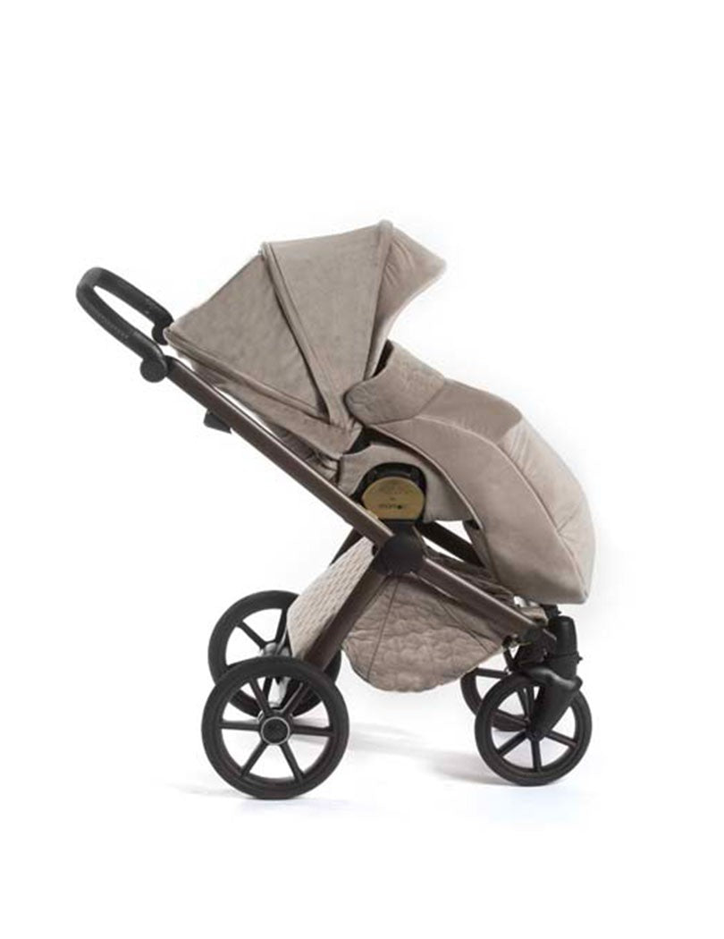 - Der Aluminiumrahmen in Wenge-Optik des Trio After 59 Velvet Champagne eignet sich für die alternative Montage von Babywanne und Kinderwagen. Es ermöglicht eine schnelle Kopplung der verschiedenen Komponenten, da das Verriegelungssystem einfach und intuitiv ist.
