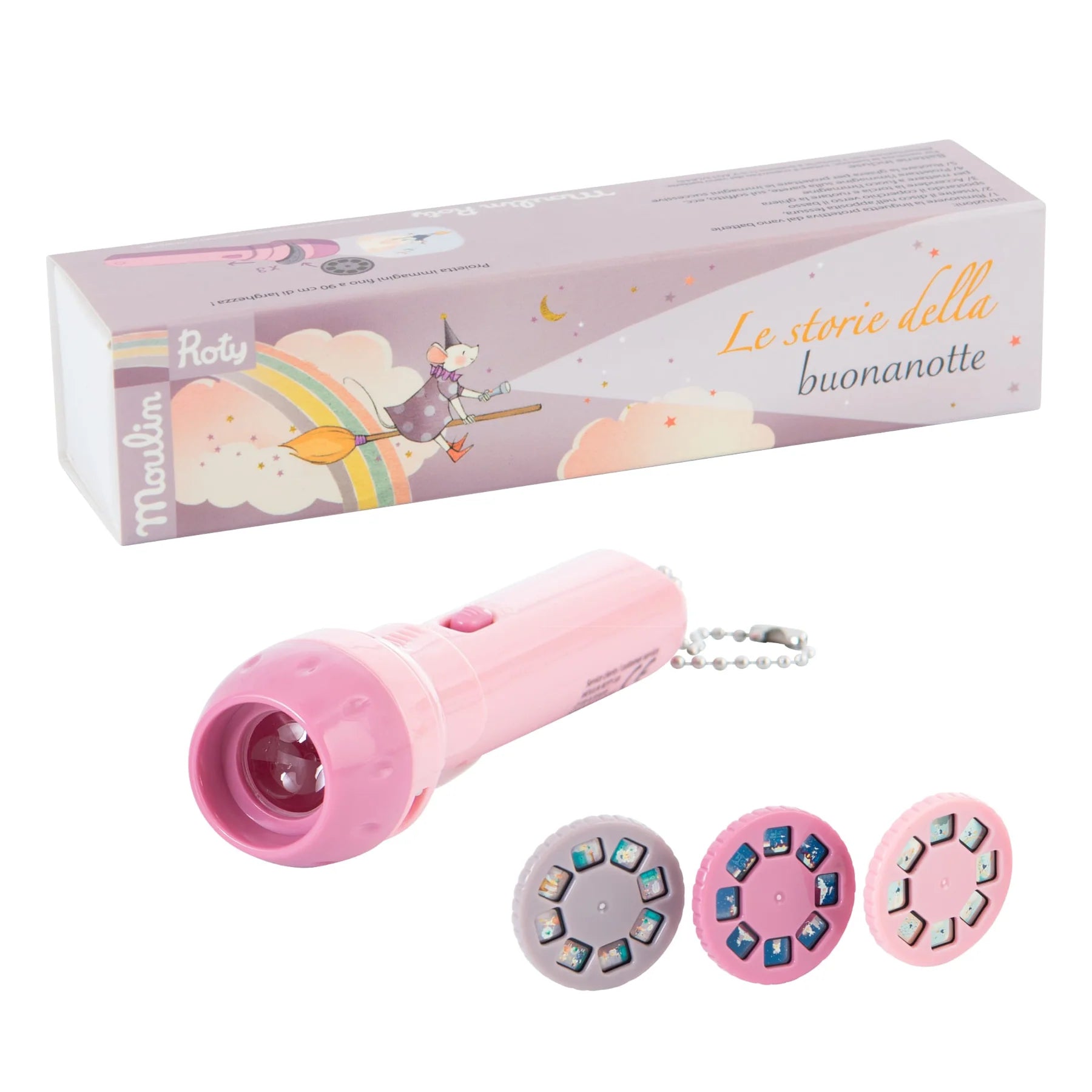 Träumen und kreieren Sie mit der Moulin Roty Goodnight Stories Projektionslampe ! Ein lustiges Lichtspiel wie die Rutschen der Vergangenheit, um das Abenteuer von „ Il ètait une fois “ zu erzählen und der Fantasie der Kinder freien Lauf zu lassen, bevor sie einschlafen. Ändern Sie Geschichten, erfinden Sie Geschichten und träumen Sie: Stellen Sie drei Discs mit unterschiedlichen Bildern zusammen und erleben Sie ein magisches Abenteuer!