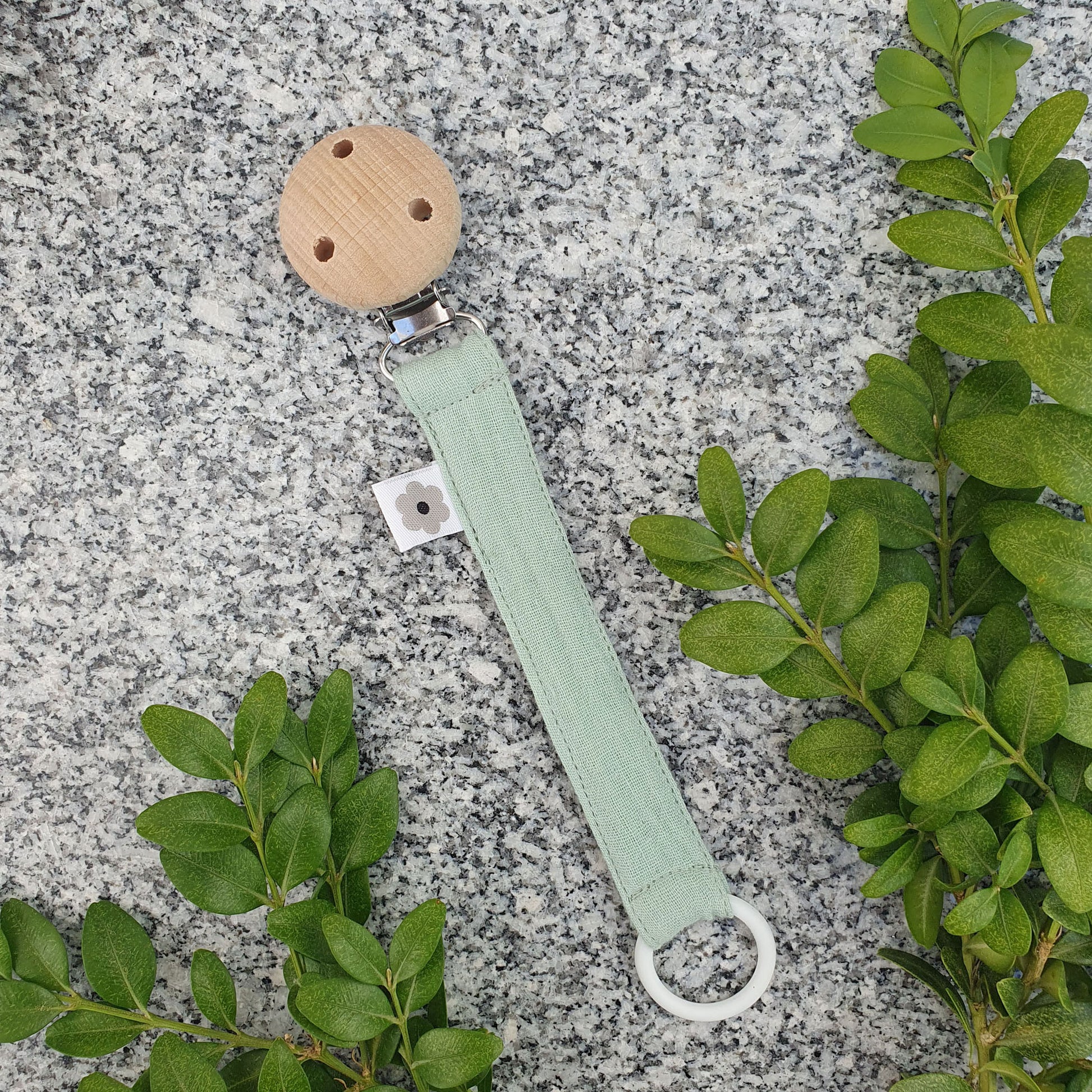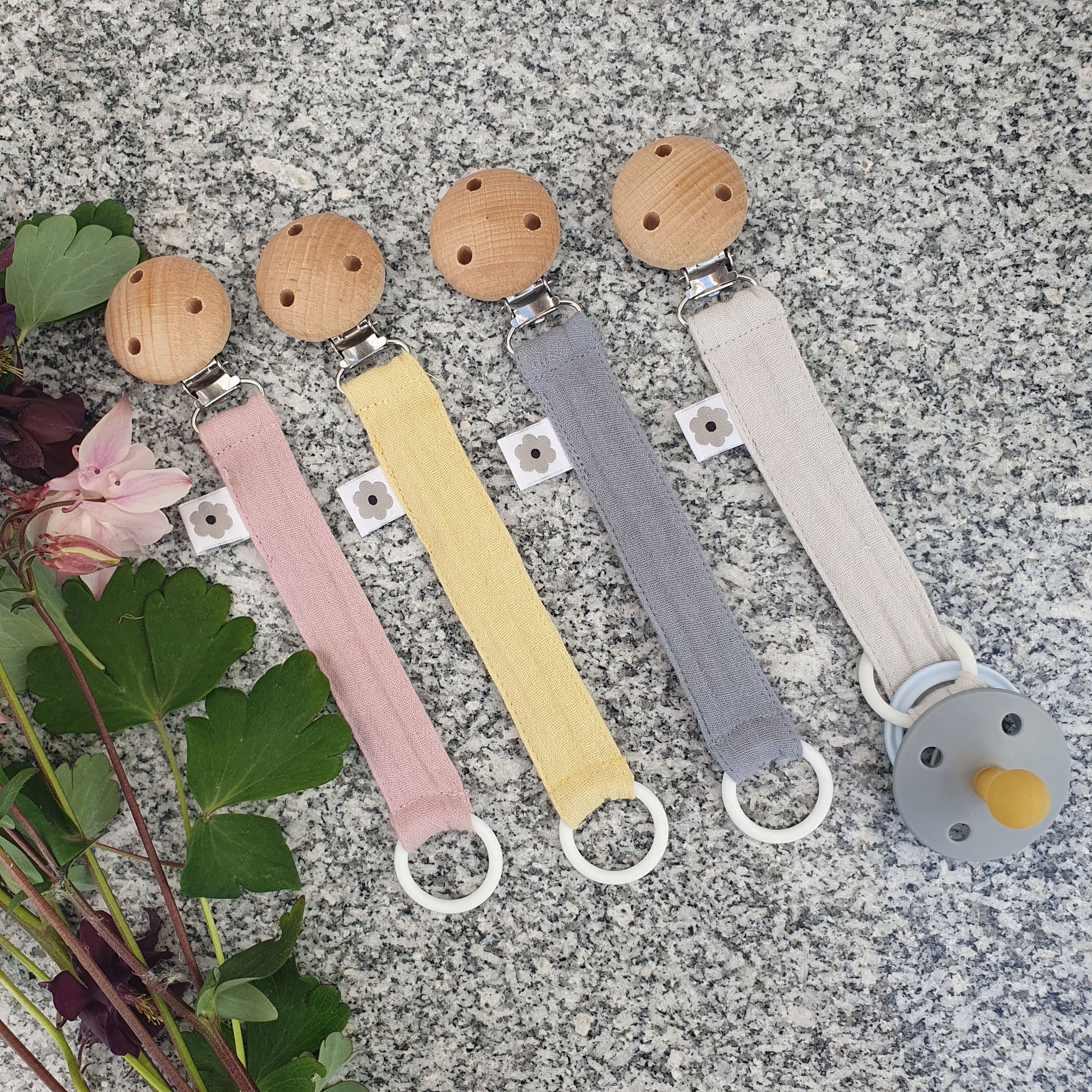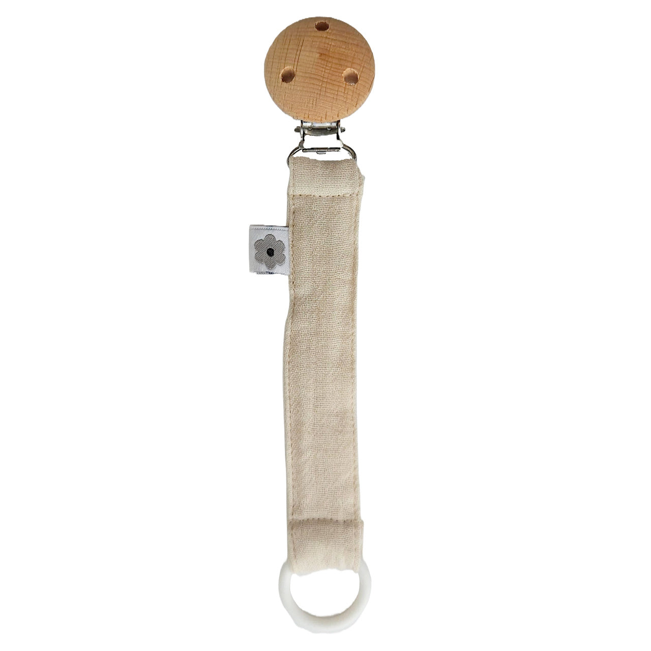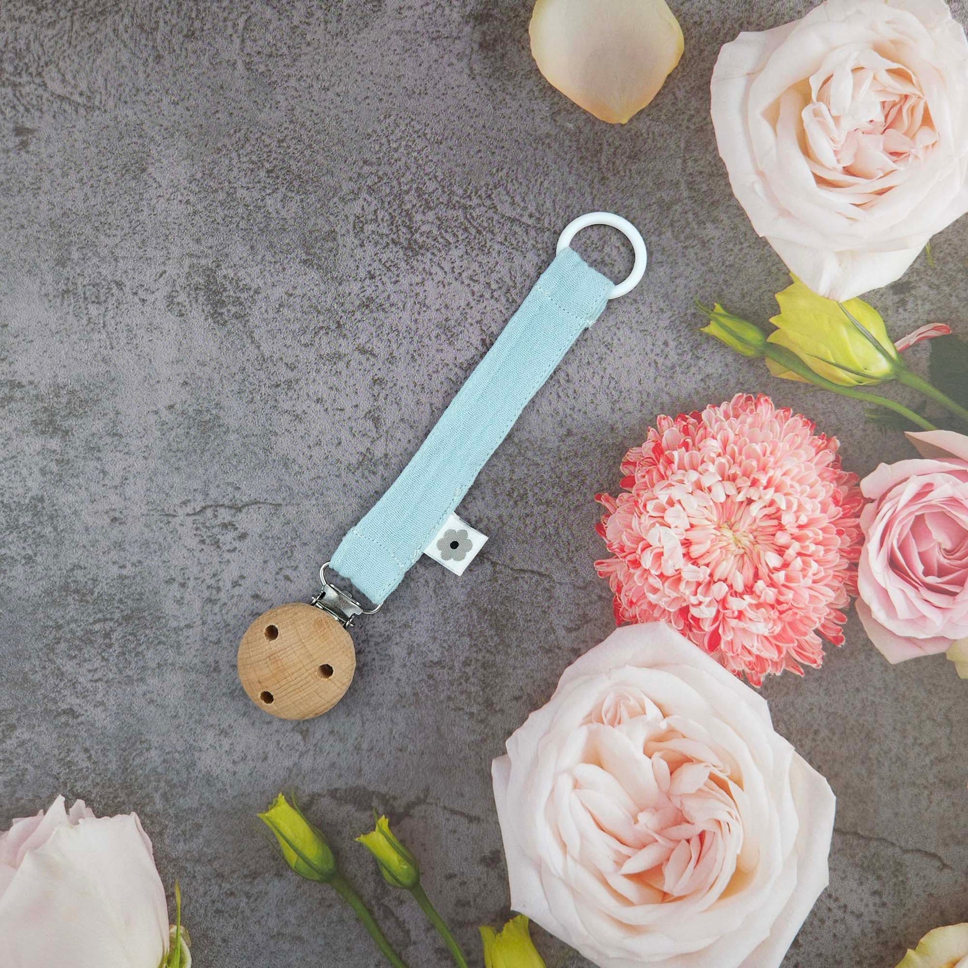 Clip per ciuccio in mussola di cotone biologico che è morbida e liscia e assicura che il ciuccio non venga perso o lasciato cadere sul pavimento.