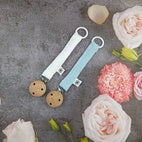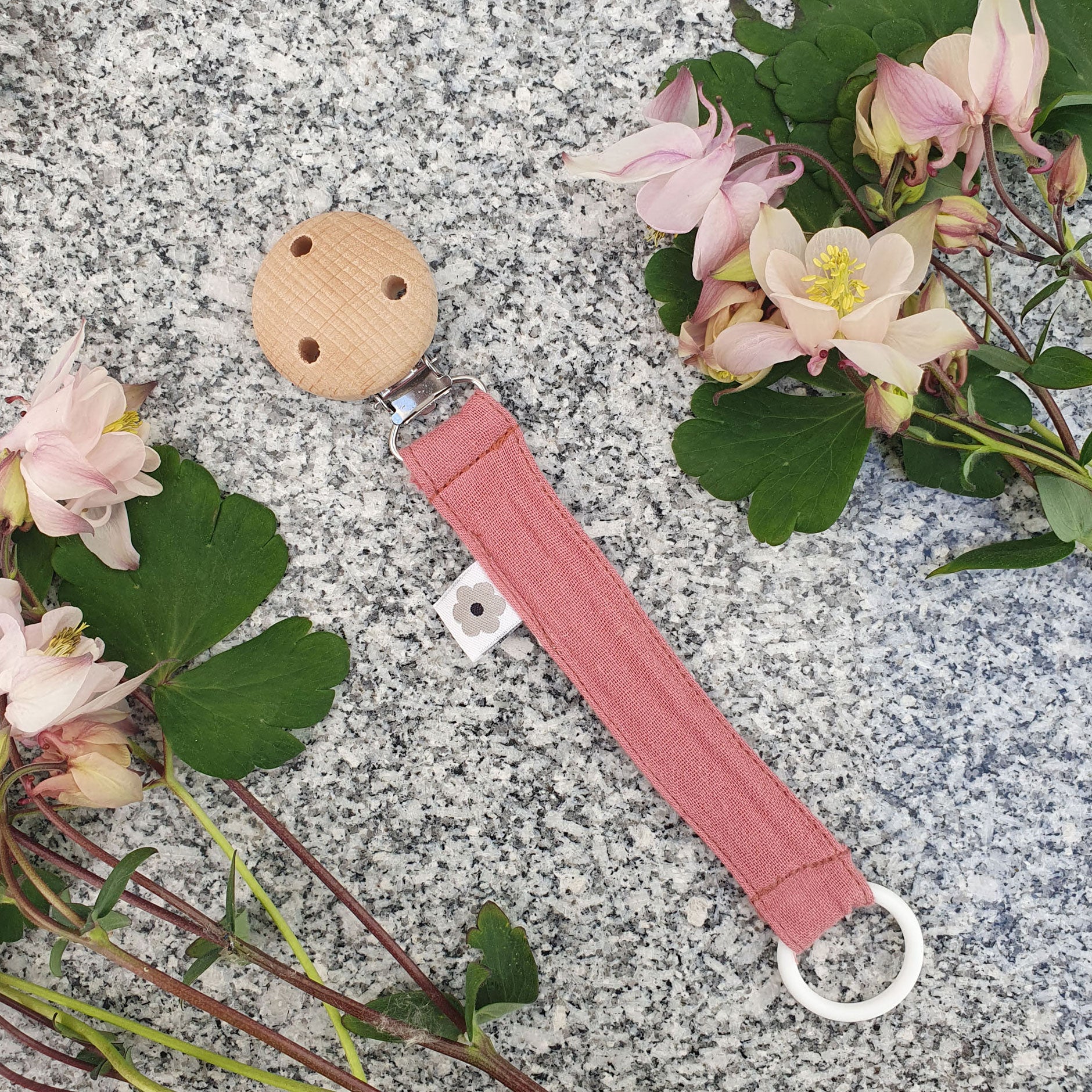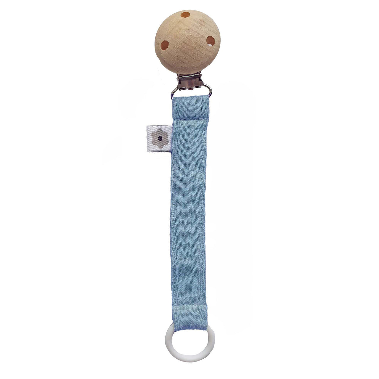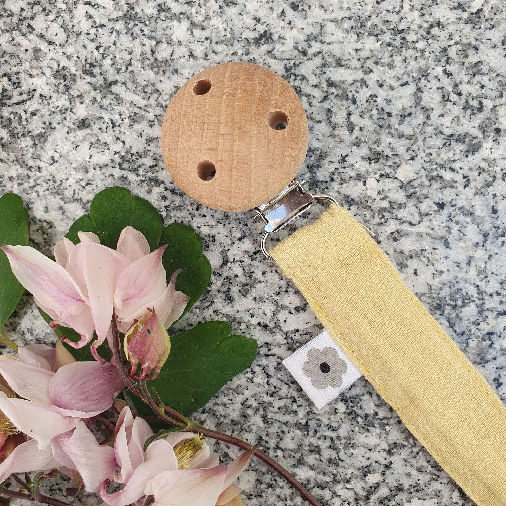 Clip per ciuccio in mussola di cotone biologico che è morbida e liscia e assicura che il ciuccio non venga perso o lasciato cadere sul pavimento.