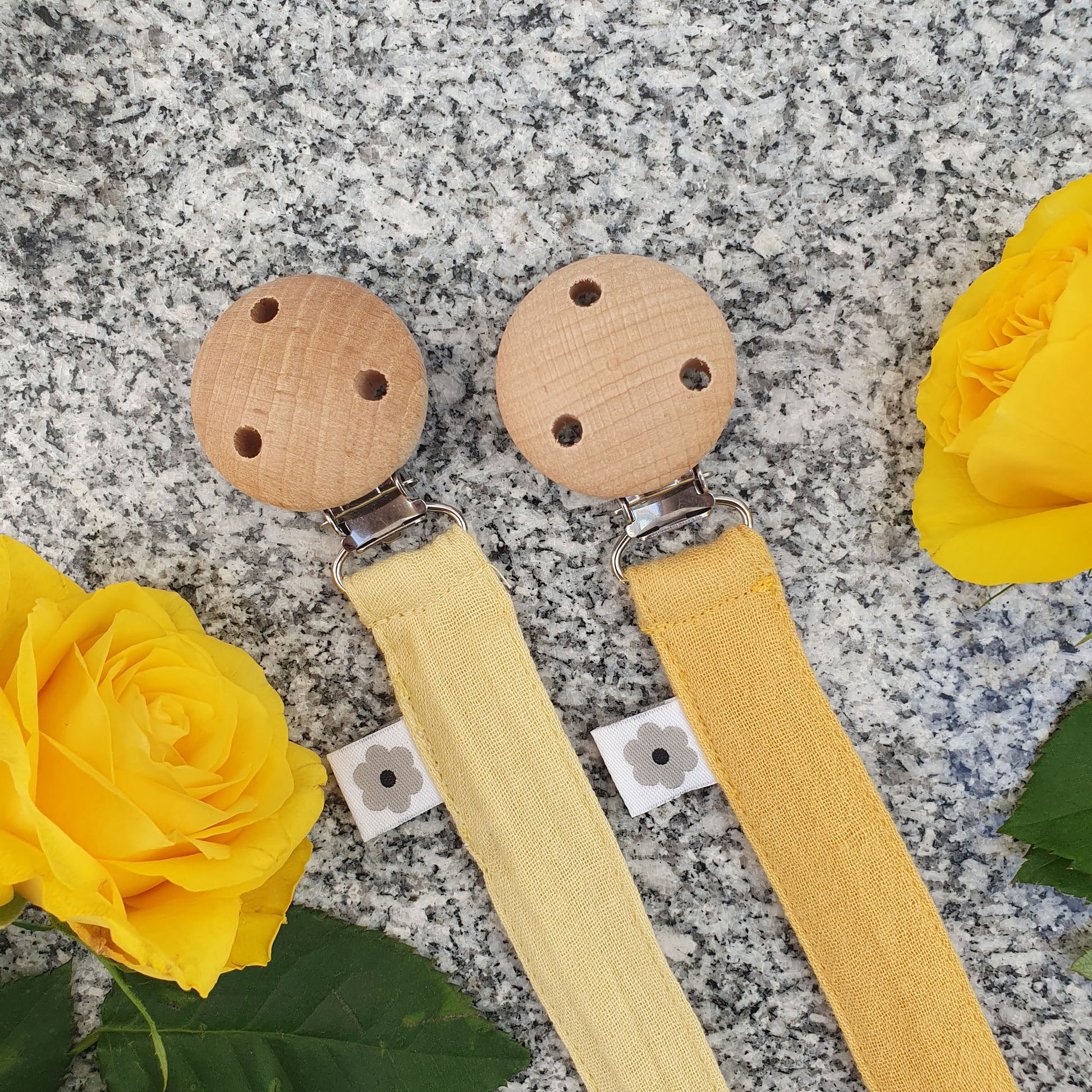 Realizzato in 100% cotone organico, clip in legno di faggio e anello in acciaio nichel free e silicone.