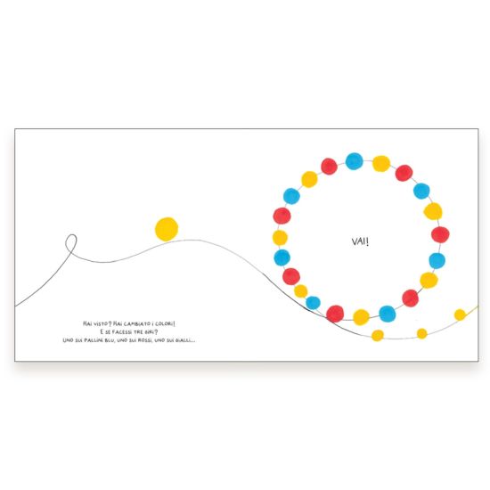 Un semplice pallino giallo al centro della prima pagina diventa un personaggio con sentimenti ed emozioni, che esprime le sue paure e i suoi desideri, incoraggiando il bambino a giocare insieme.