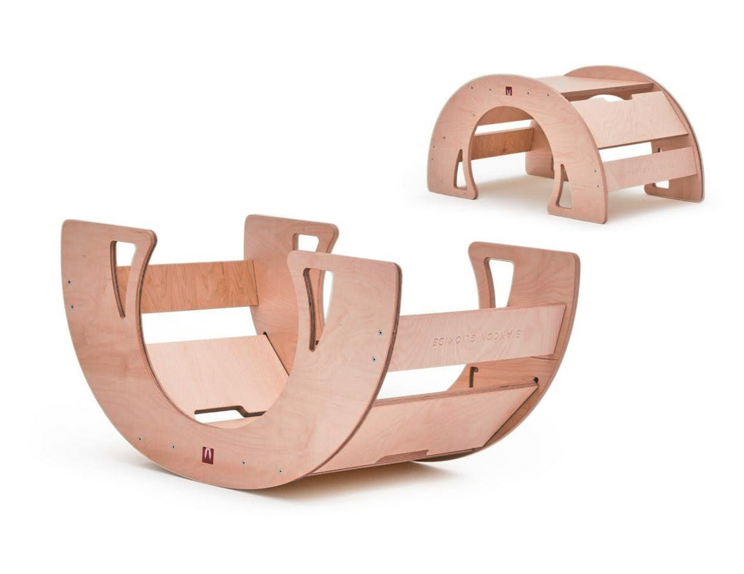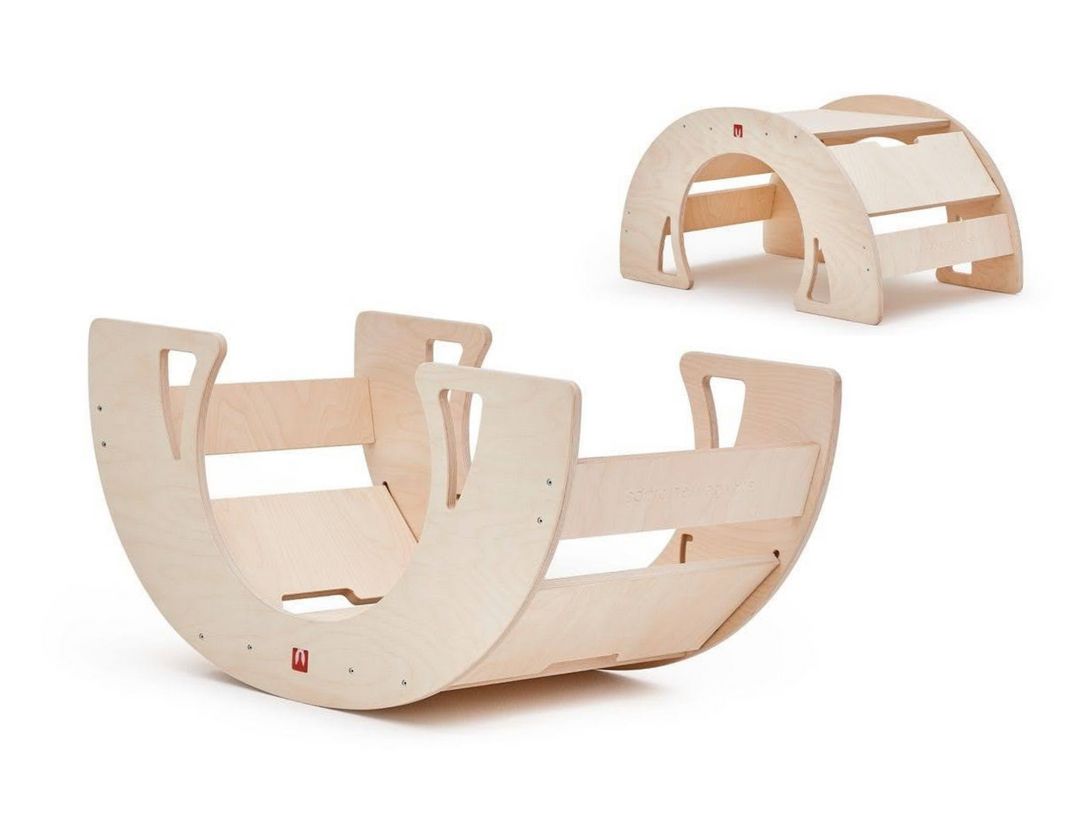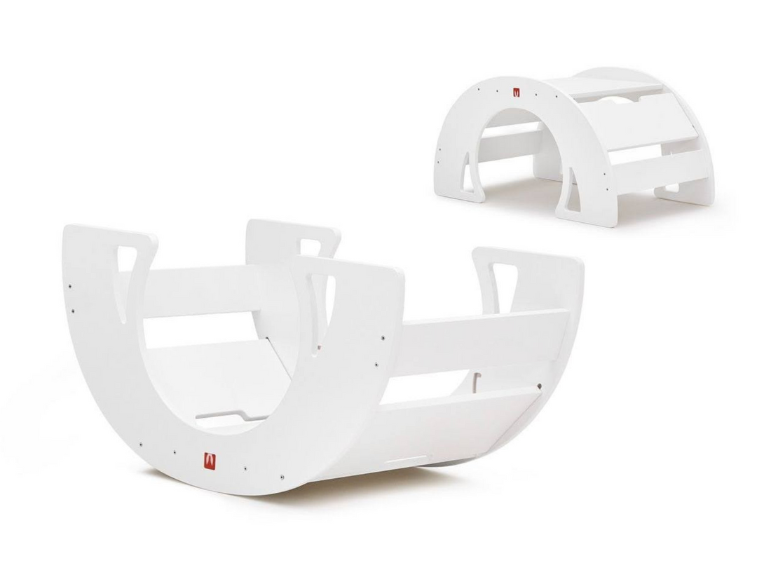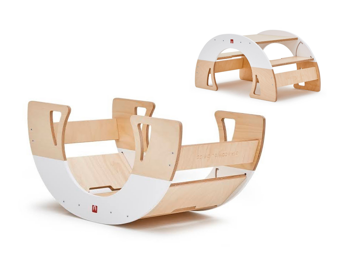 Progettato con esperti di motricità, si trasforma in pochi secondi da dondolo a tavolino doppia seduta, offrendo 9 esercizi motori e cognitivi.