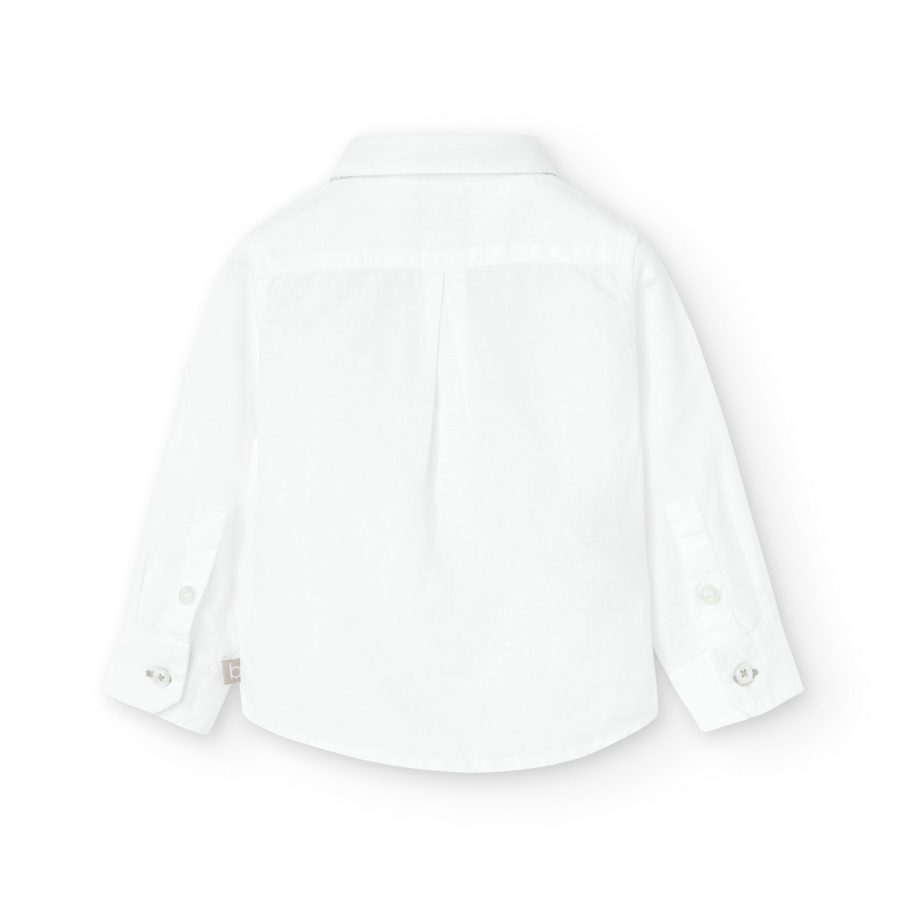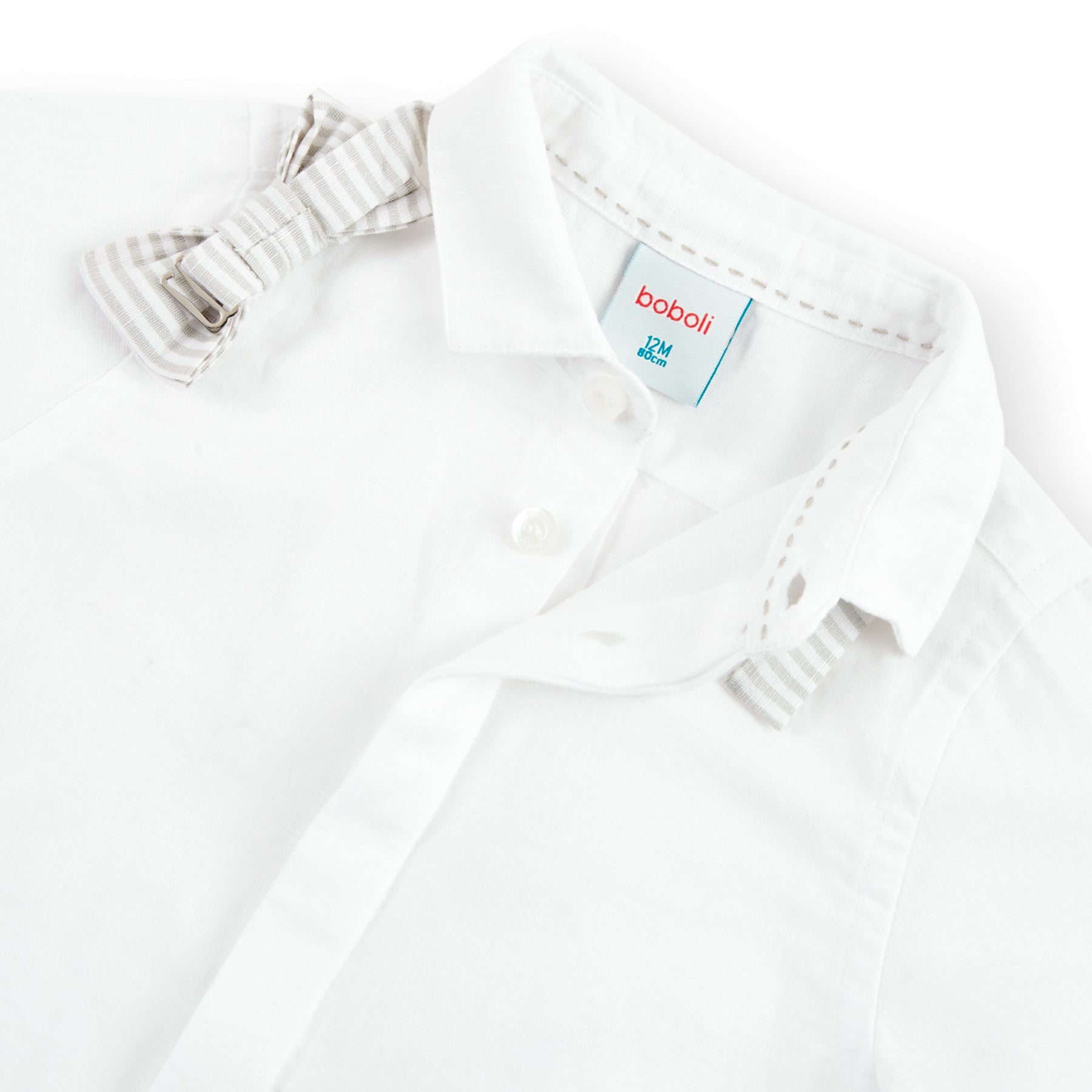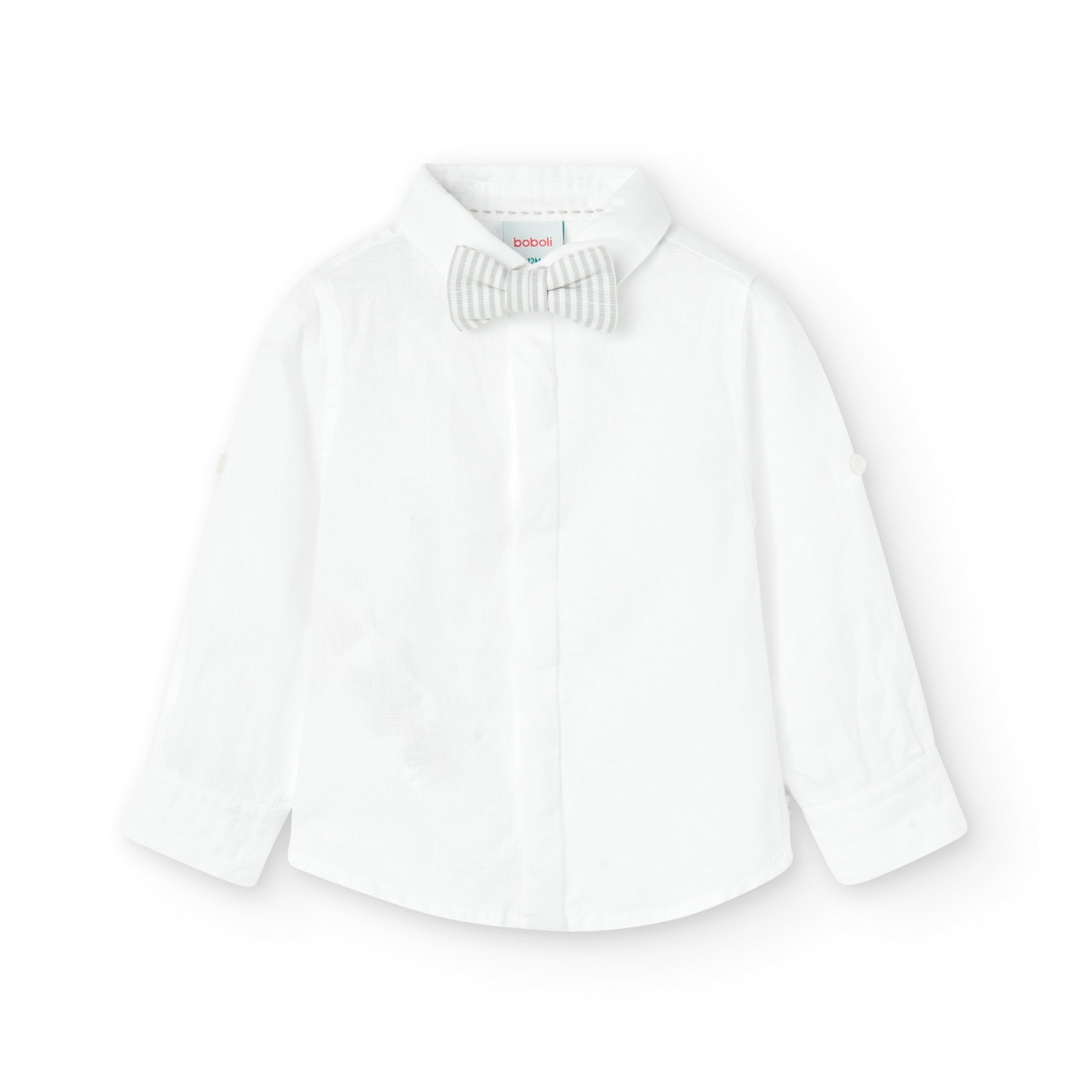 Camicia bianca per bambino in lino a maniche lunghe. Le maniche possono essere arrotolate e chiuse con un cinturino e un bottone. A dare un tocco di eleganza in più, un papillon di lino a righe bicolore, bianco e beige.