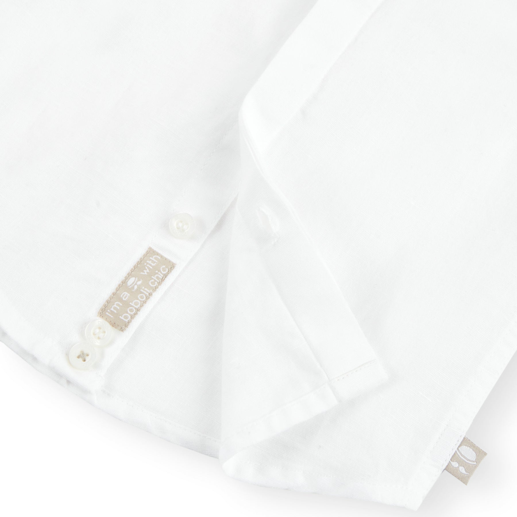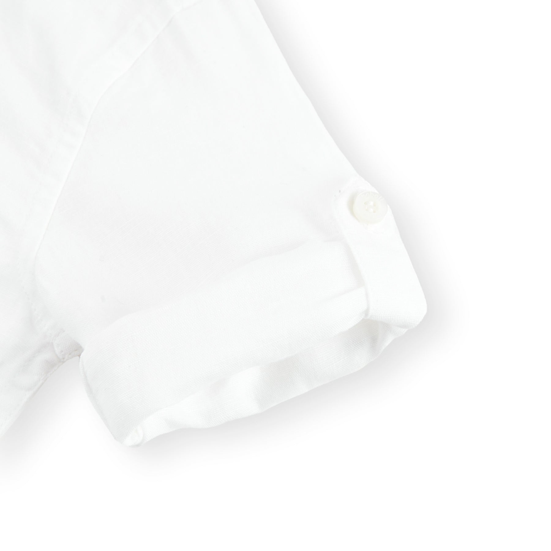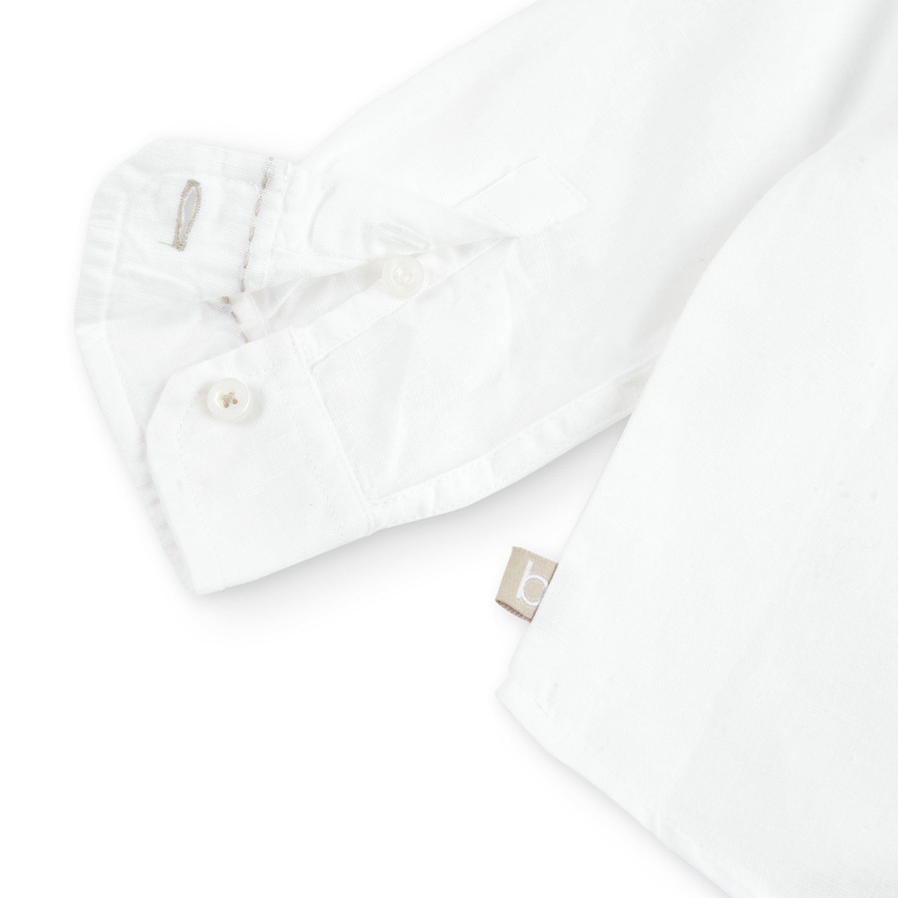 Camicia bianca per bambino in lino a maniche lunghe. Le maniche possono essere arrotolate e chiuse con un cinturino e un bottone. A dare un tocco di eleganza in più, un papillon di lino a righe bicolore, bianco e beige.