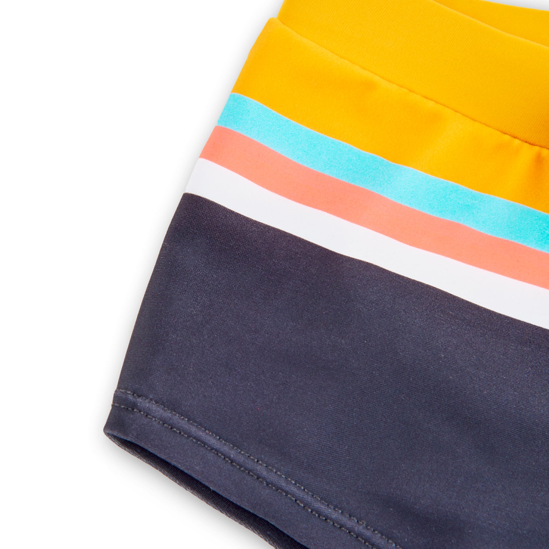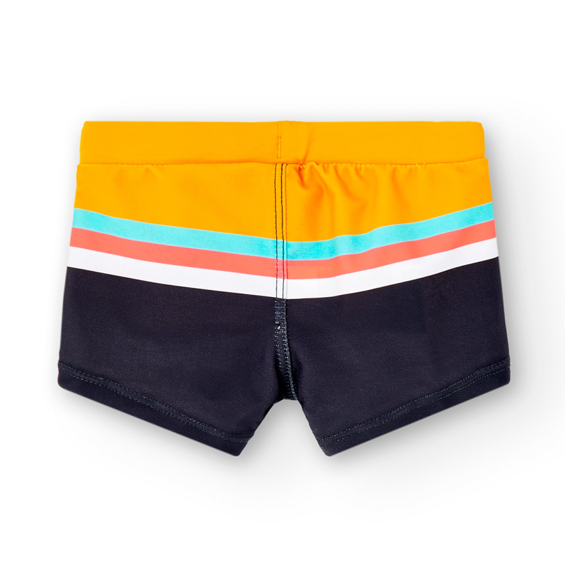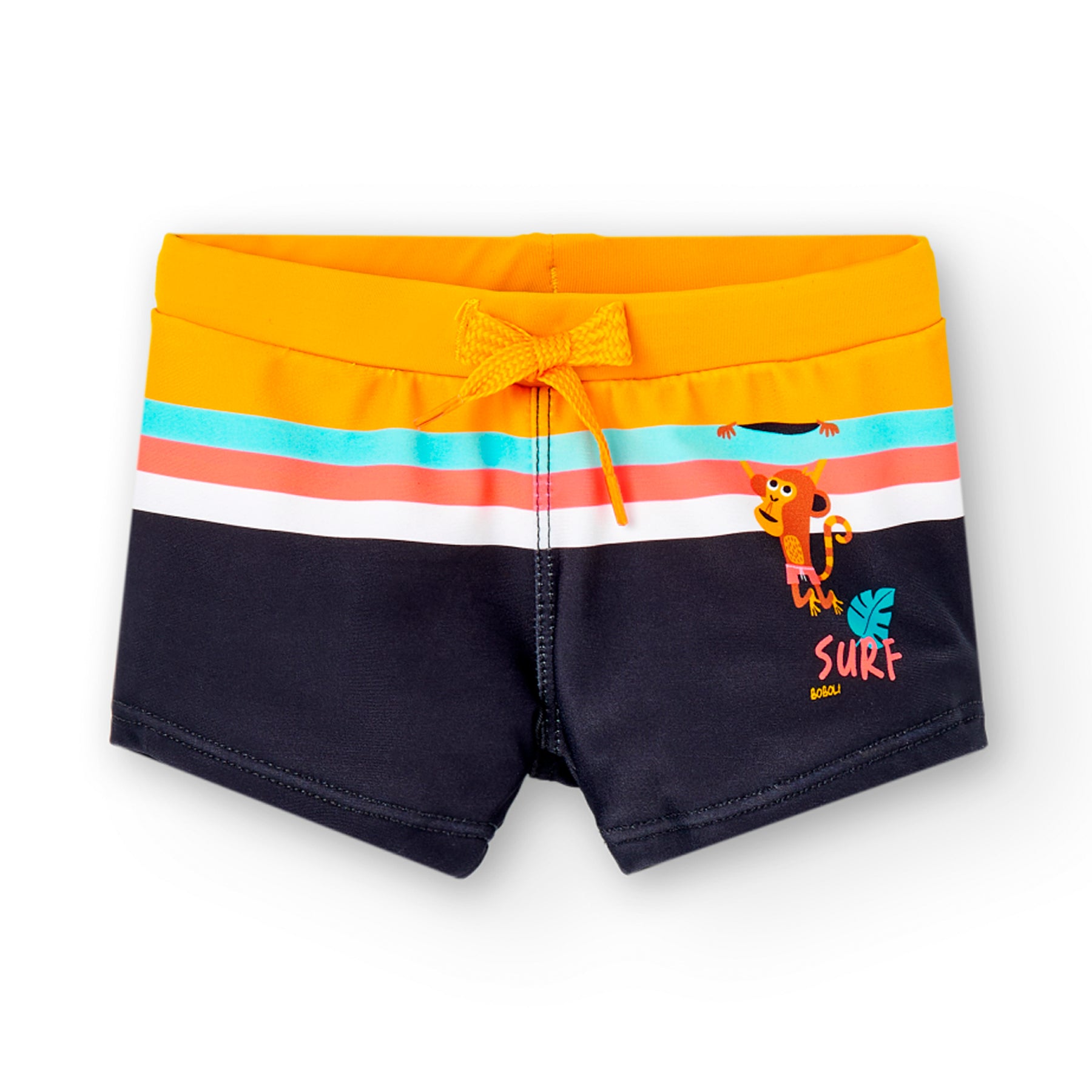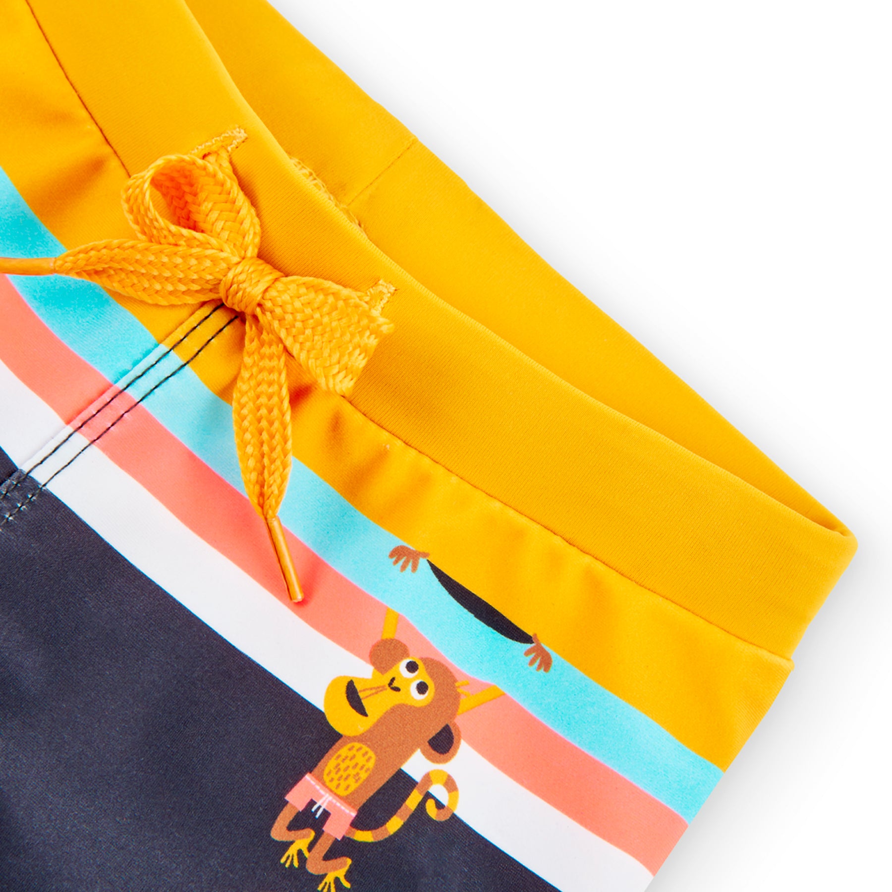Costume boxer elasticizzato in poliammide da bimbo, con strisce di vari colori, cintura color ocra. Si regola in vita con elastico interno e coulisse. La decorazione è una stampa di una simpatica scimmietta.