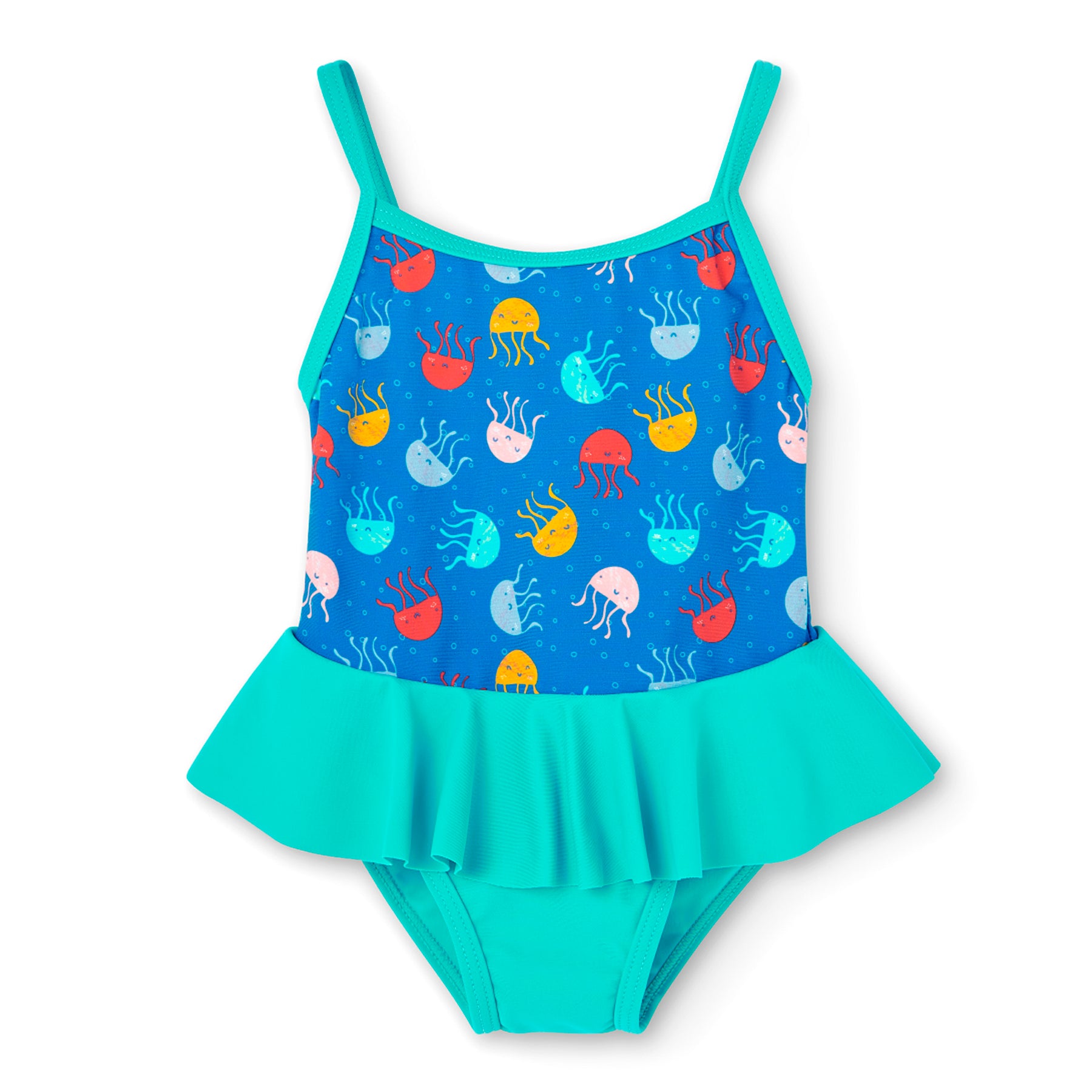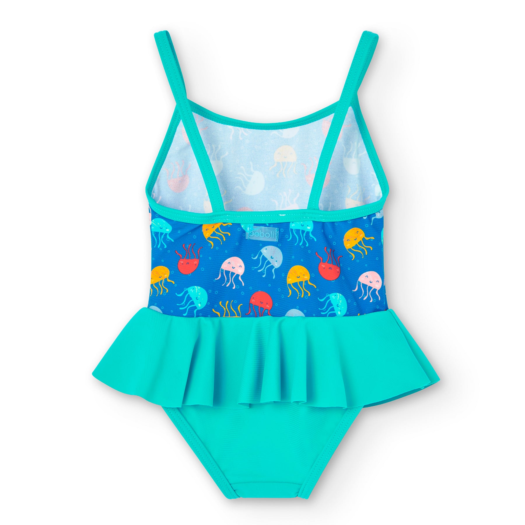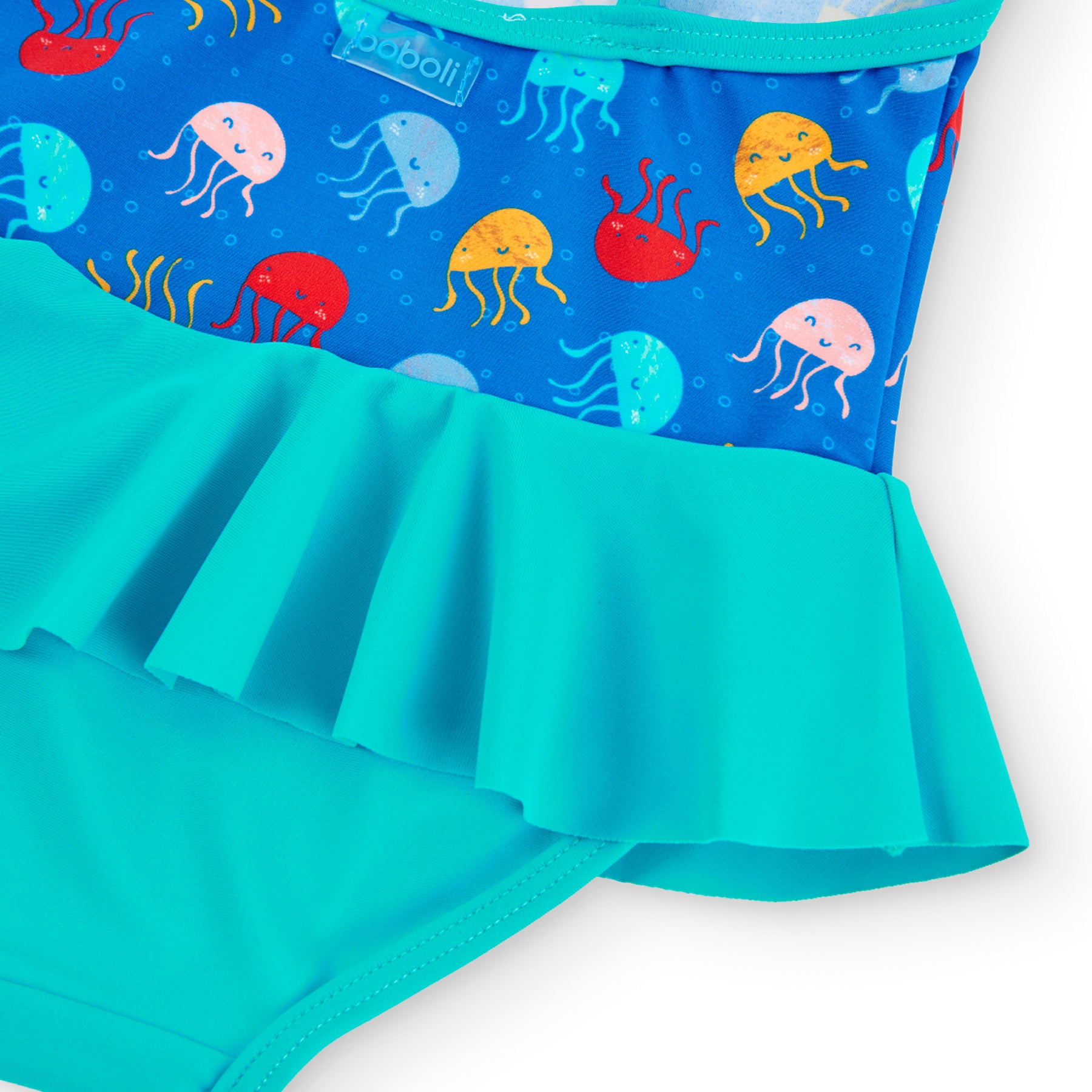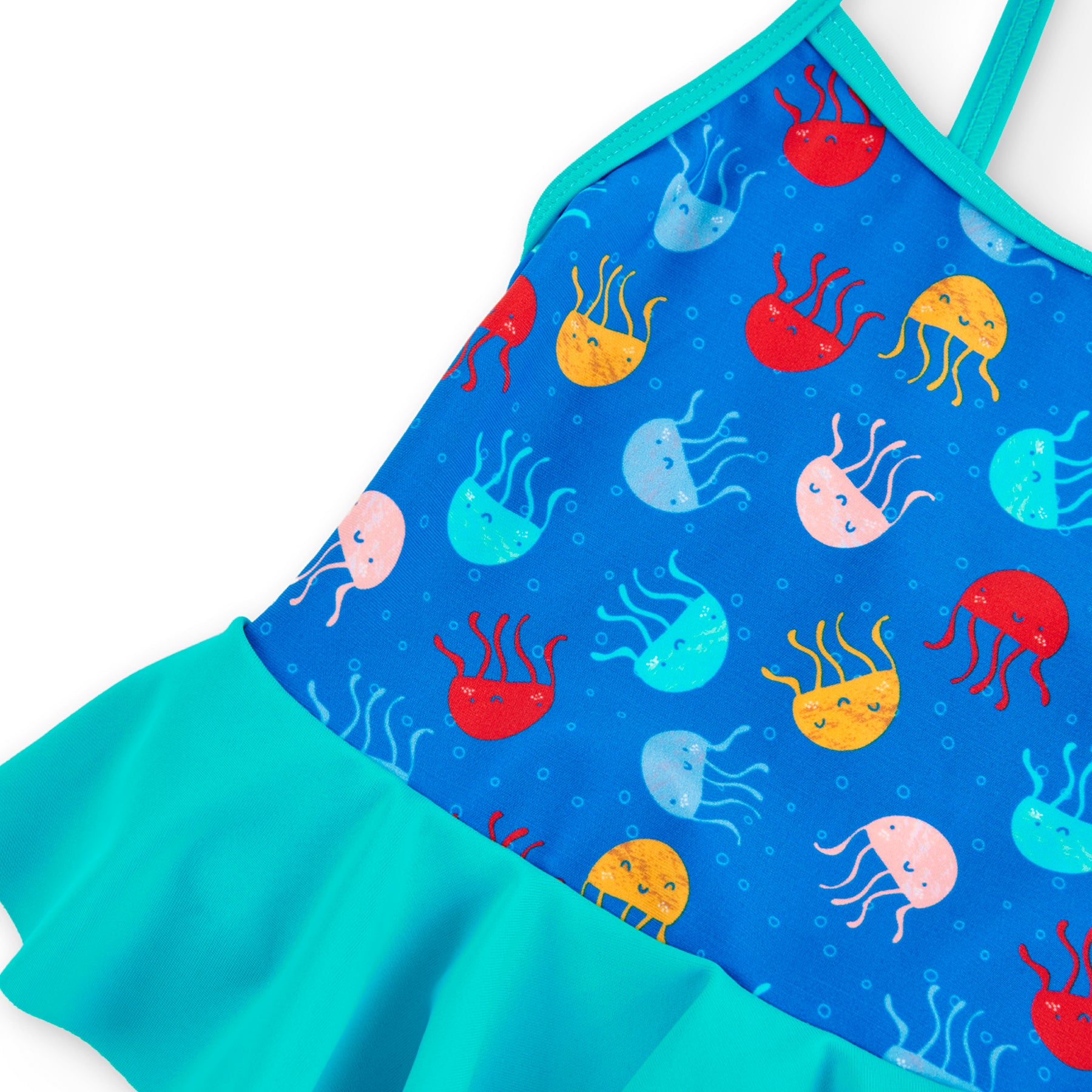 Costume da bagno da bimba in poliammide con stampa di meduse in vari colori e volant turchese in vita.