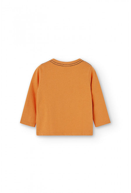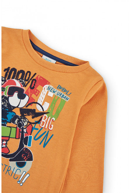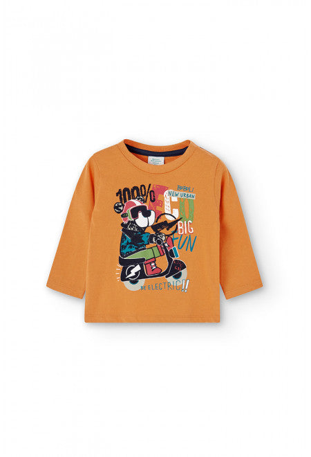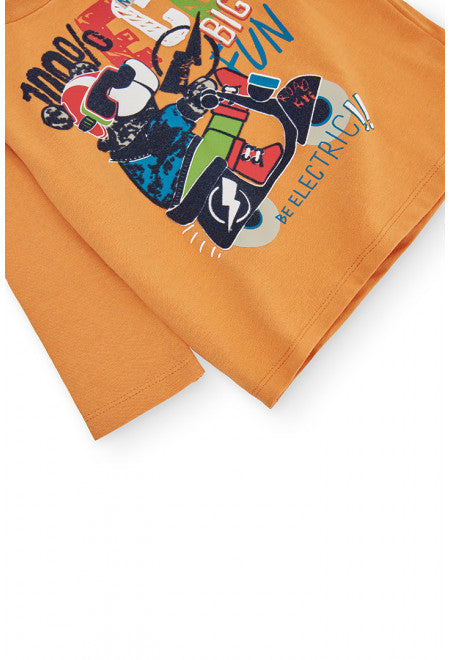 T-shirt da bambino in cotone color caramello. La decorazione è una stampa sul davanti di un orso divertente e lettere in diversi colori.