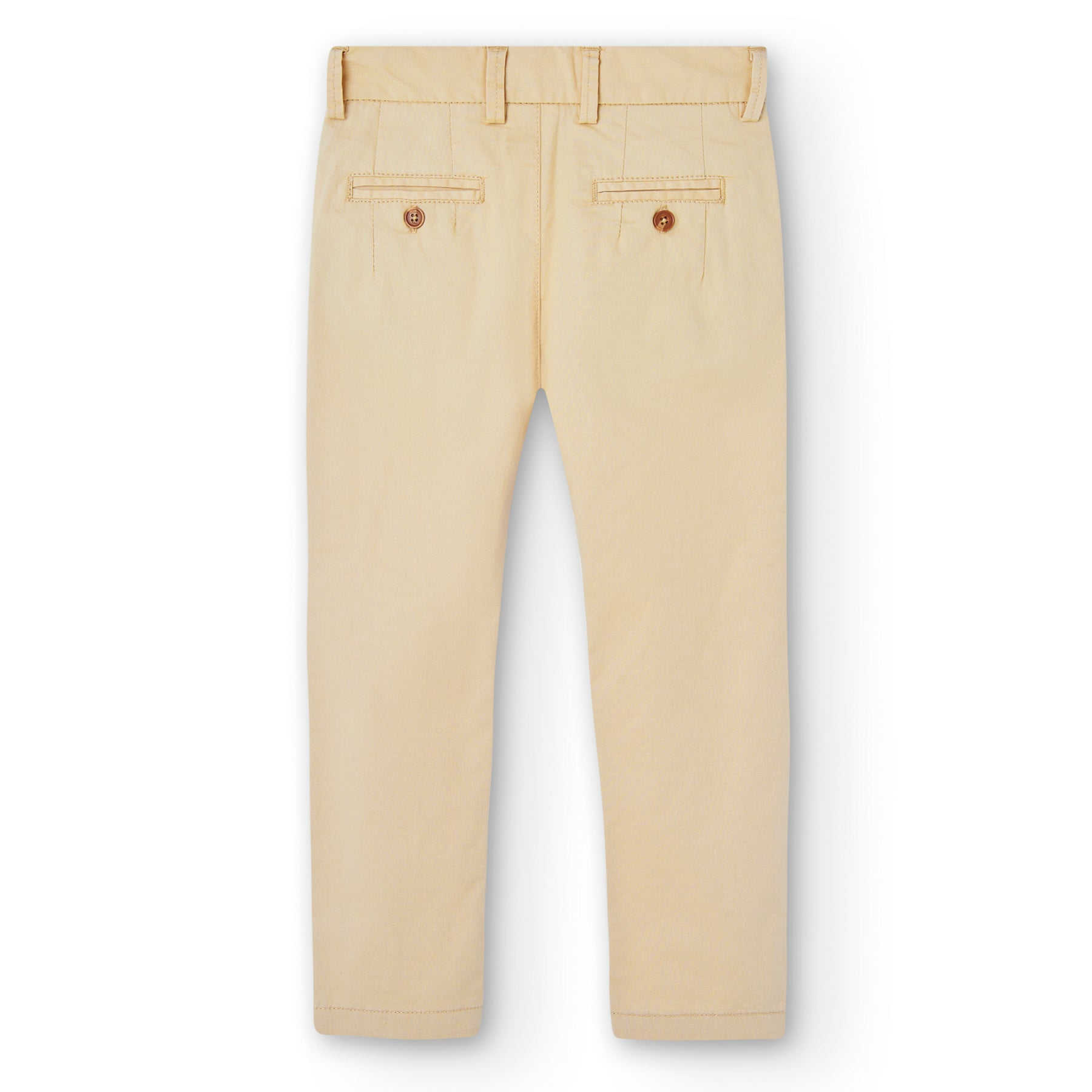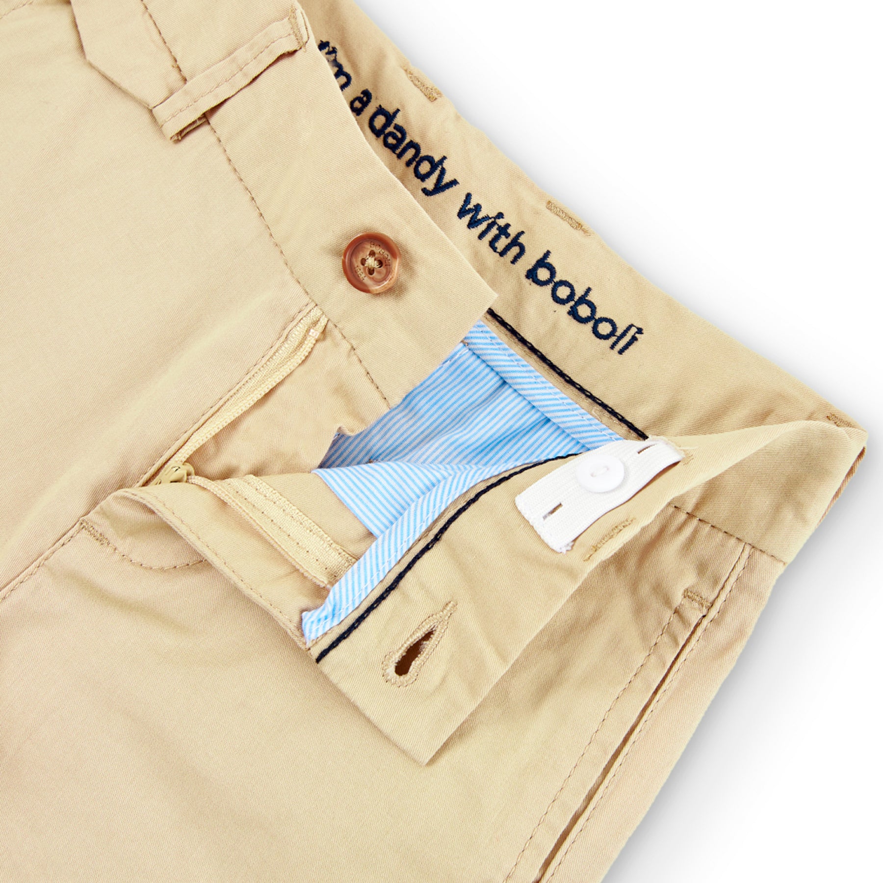 Pantaloni skinny da bambino in satin elasticizzato color cammello. La patta si chiude con bottone metallico e cerniera. La vita è regolabile grazie a un elastico interno con asole e un bottone su entrambi i lati. Tasche posteriori con bottone. Ha come dettaglio l'etichetta della marca e ricamo in vita.