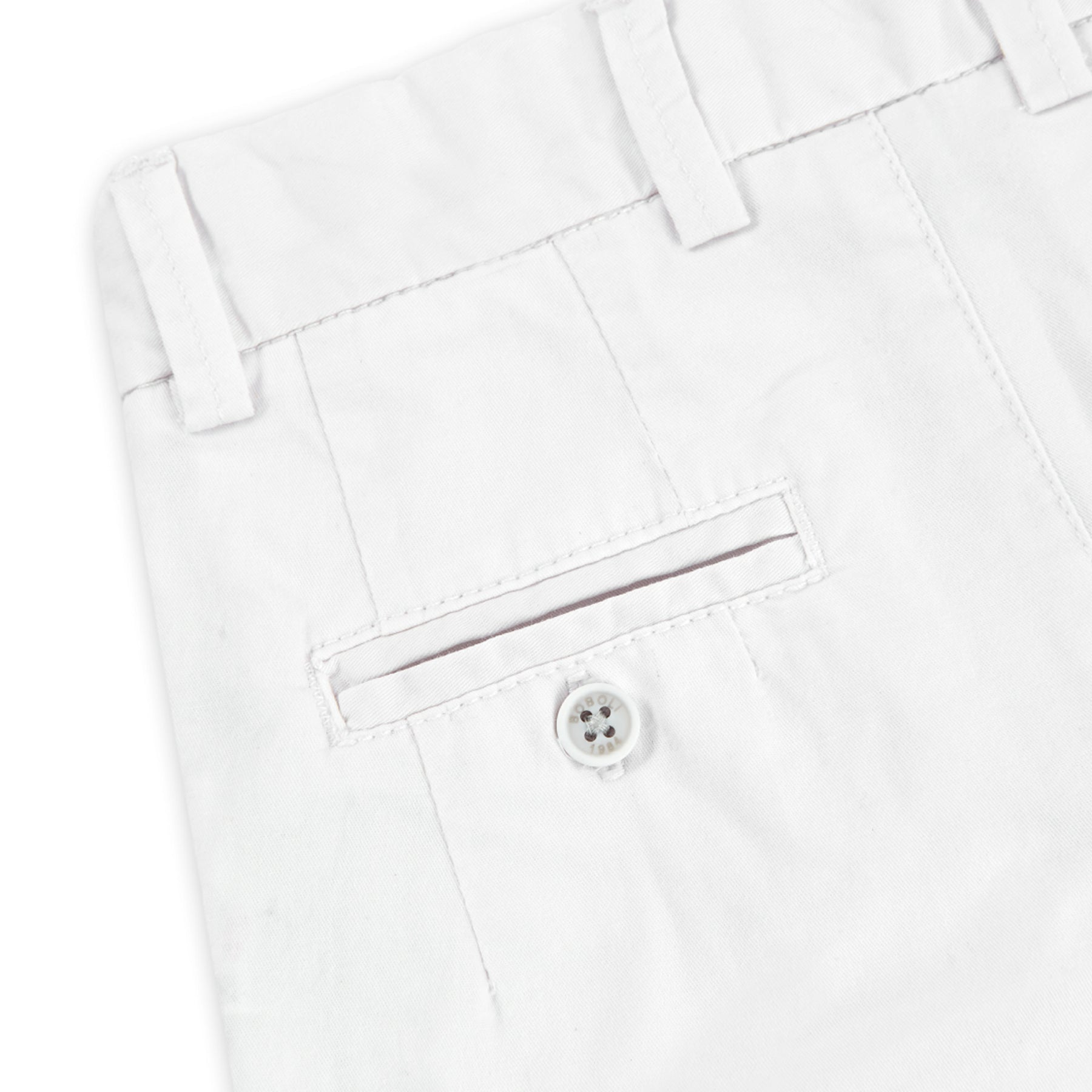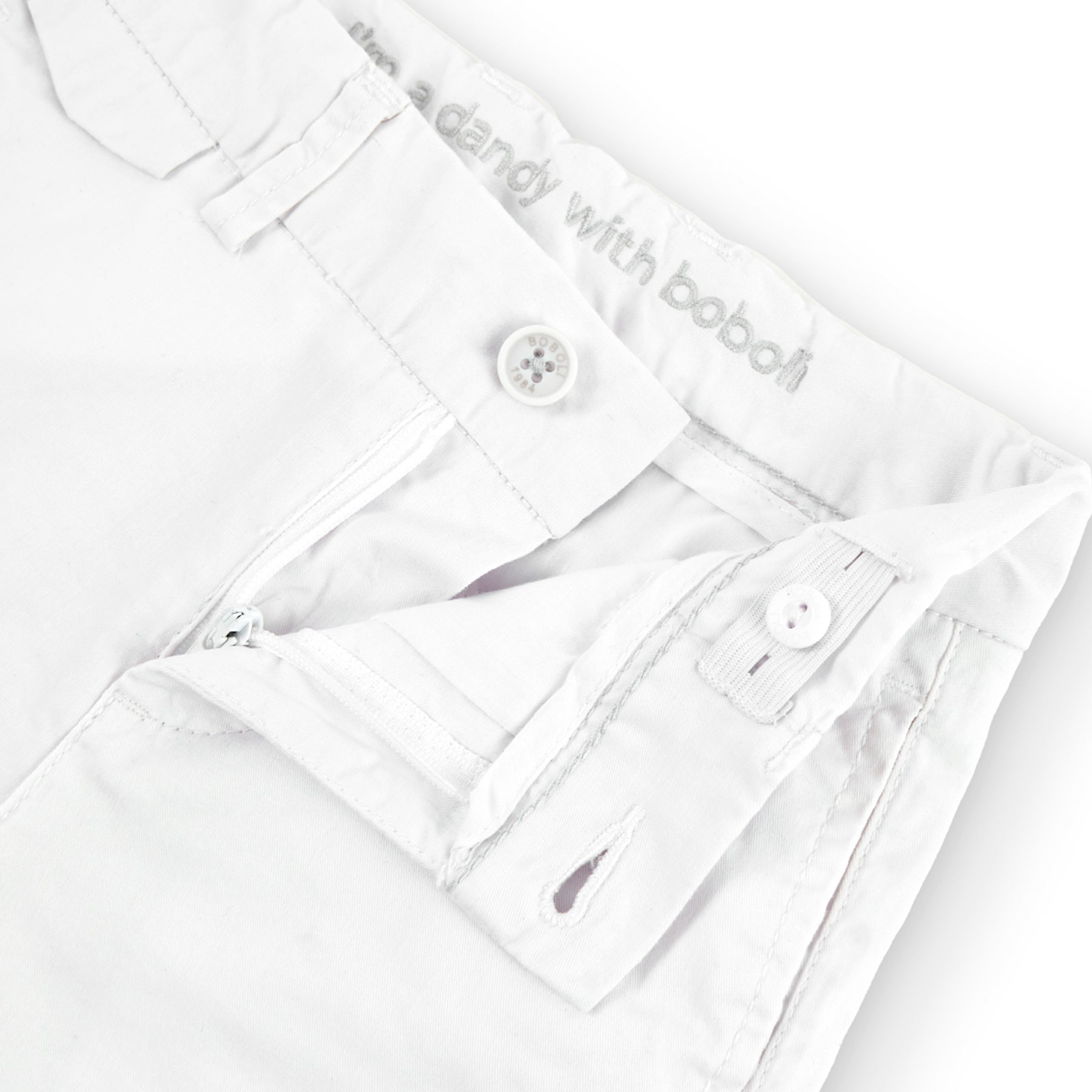 Bermuda da bambino in satin elasticizzato color bianco. La patta si chiude con bottone metallico e cerniera. La vita è regolabile grazie a un elastico interno con asole e un bottone su entrambi i lati. Tasche posteriori con bottone. Hanno come dettaglio etichetta della marca e ricamo in vita.