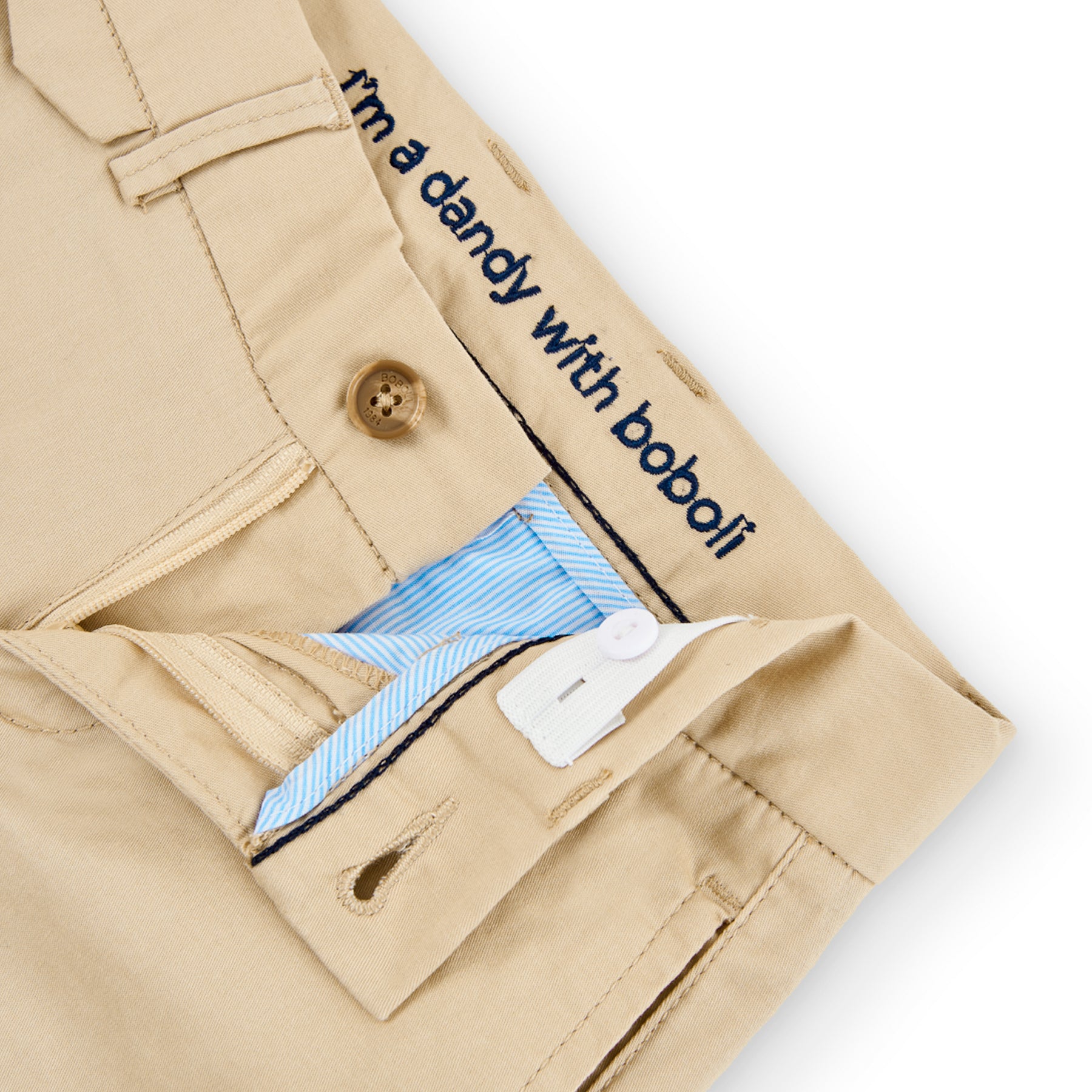 Bermuda da bambino in satin elasticizzato color cammello. La patta si chiude con bottone metallico e cerniera. La vita è regolabile grazie ad un elastico interno con asole e un bottone su entrambi i lati. Tasche posteriori con bottone. Hanno come dettaglio etichetta della marca e ricamo in vita.