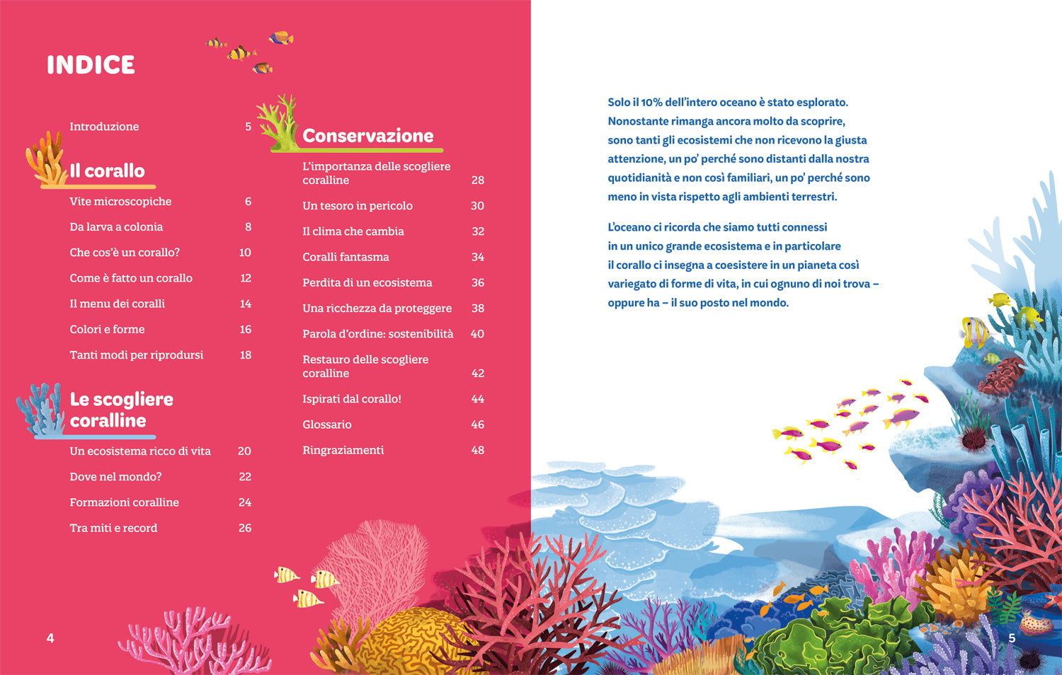 Perché un libro sulle scogliere coralline per bambini? Perché conoscere il coloratissimo universo dei coralli è qualcosa che non solo affascina e stupisce per le sue particolarità e dettagli curiosi, ma serve anche a sensibilizzare le giovani generazioni rispetto a un tema molto importante, quello della salvaguardia di tutti gli ecosistemi. Il libro mostra attraverso illustrazioni a tutta pagina la natura dei coralli e delle sue formazioni con un approccio scientifico scandito da un linguaggio semplice e da argomenti quali la biologia, l’ecologia e la conservazione.