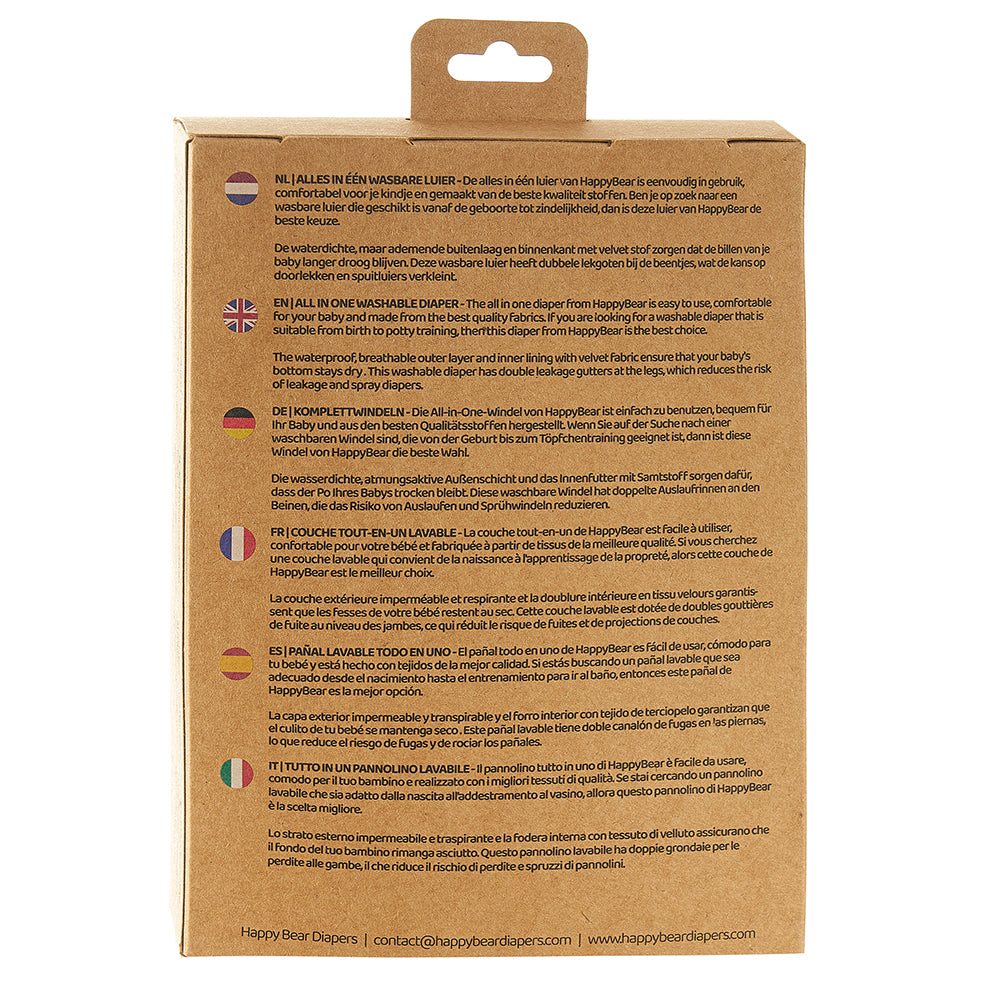 In taglia unica, facilmente regolabile grazie ai bottoni a pressione sulla parte anteriore o al velcro sulla circonferenza in modo da poter utilizzare il pannolino dalla nascita fino a quando il bambino non impara a usare il vasino.