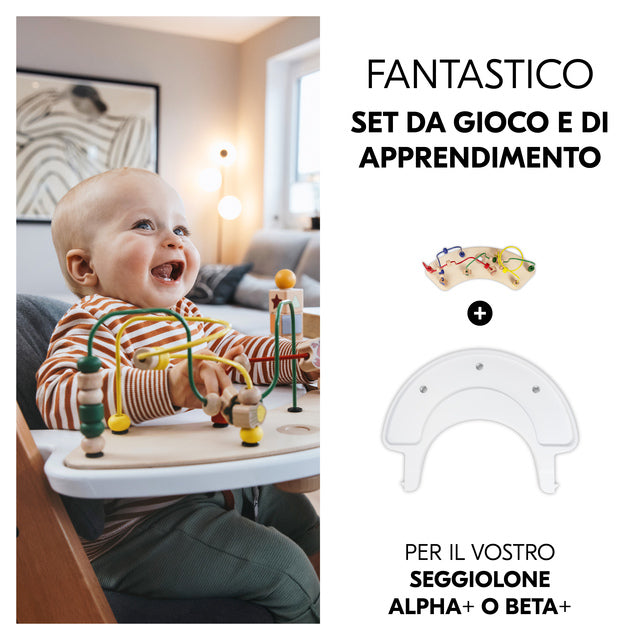 La base si aggancia alla barra anteriore del seggiolone con un semplice clic e può essere rimossa altrettanto rapidamente. Gli accessori per il gioco si fissano in un attimo grazie a una vite di legno, in modo da rimanere saldamente al loro posto durante i momenti di gioco. La base può essere utilizzata anche con l'imbracatura a 5 punti e la cinghia inguinale dei seggioloni in legno Alpha+ e Beta+, in modo che il tuo piccolo, a partire dai 6 mesi, possa continuare a stare seduto nel seggiolone in tutta sicurezza.