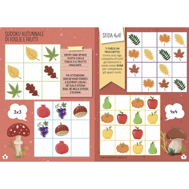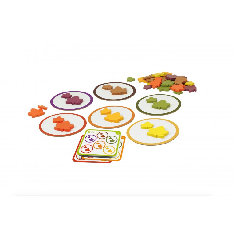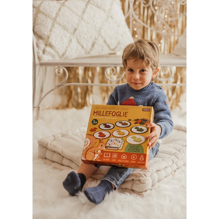 All'interno della scatola troverai: un libro di 16 pagine ricco di giochi di logica, 48 foglie di legno, 6 dischi rigidi, 20 carte millefoglie.