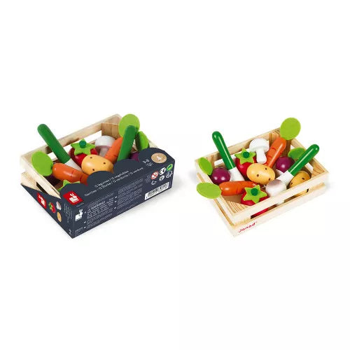 Che bella questa cassetta di verdure!!! Il tuo bambino potrà divertirsi sentendosi al mercato o in cucina, con queste verdure di legno coloratissime. Adatte a bambini dai 3 anni in su, la cassetta contiene: 2 porri con radici di cotone, 2 ravanelli con foglie di feltro verde, 2 patate, 2 funghi, 2 pomodori e 2 carote con foglie di feltro. Ideale per imparare il nome delle verdure e favorire la condivisione attraverso il gioco dell'imitazione.