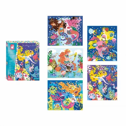 C'è una festa nelle profondità oceaniche! Con questo kit artistico sul tema delle sirene, i bambini dai 6 anni in su potranno decorare 5 quadretti adesivi con le paillettes: un'attività di collage che combina precisione e creatività. Sirene, coralli e animali marini sono pronti a scintillare come mai prima d'ora! Questo kit di attività creative contiene: 5 quadretti adesivi, 800 paillettes e 1 libretto di istruzioni per aiutare i piccoli artisti. Le paillettes sono curve e di colori e dimensioni differenti: ideali per sviluppare la concentrazione e la logica dei più piccoli. Per decorare i quadretti basta scoprire le parti adesive e applicarvi le paillettes, seguendo le istruzioni o la propria fantasia. La colla non è necessaria! Per completare i 5 quadretti del set sono necessarie circa 3 ore: un'attività di bricolage divertente e rilassante per i bambini. I piccoli artisti si immergeranno nelle profondità marine con questo kit creativo della collezione "Les Ateliers du Calme"!