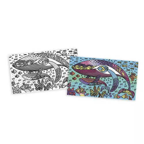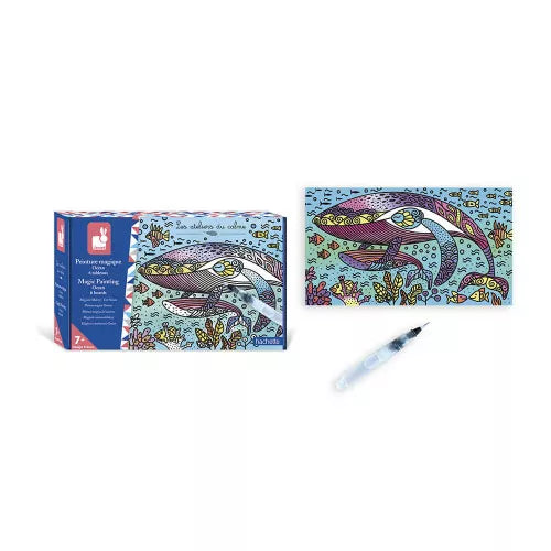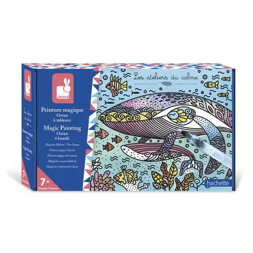Avviso ai piccoli artisti che amano anche la magia! Con questo set creativo, i bambini dai 7 anni in su scopriranno che dipingere con l'acqua può rivelare un universo di colori! Come? È molto semplice! Con il pennello dotato di serbatoio d'acqua, riempi attentamente ciascuna area di questi 6 quadretti: l'inchiostro nero delle illustrazioni diventerà colorato come per magia, e appariranno illustrazioni incredibili sul tema dell'oceano con balene, sirene e piovre! Questa attività creativa della collezione Les Ateliers du Calme è perfetta per esercitare la concentrazione e la manualità dei bambini. Per completare ciascun quadretto sono necessari circa 20 minuti.