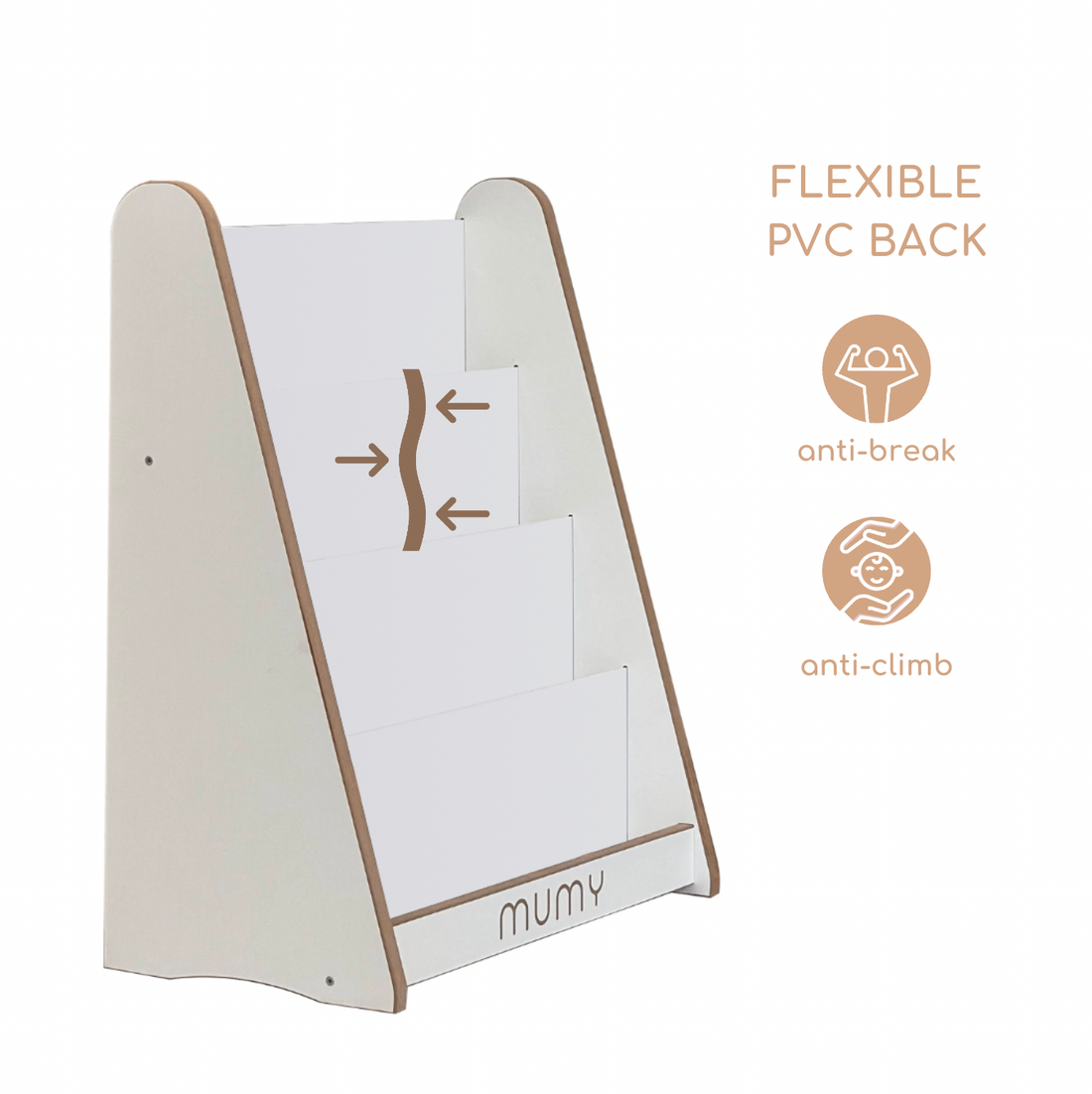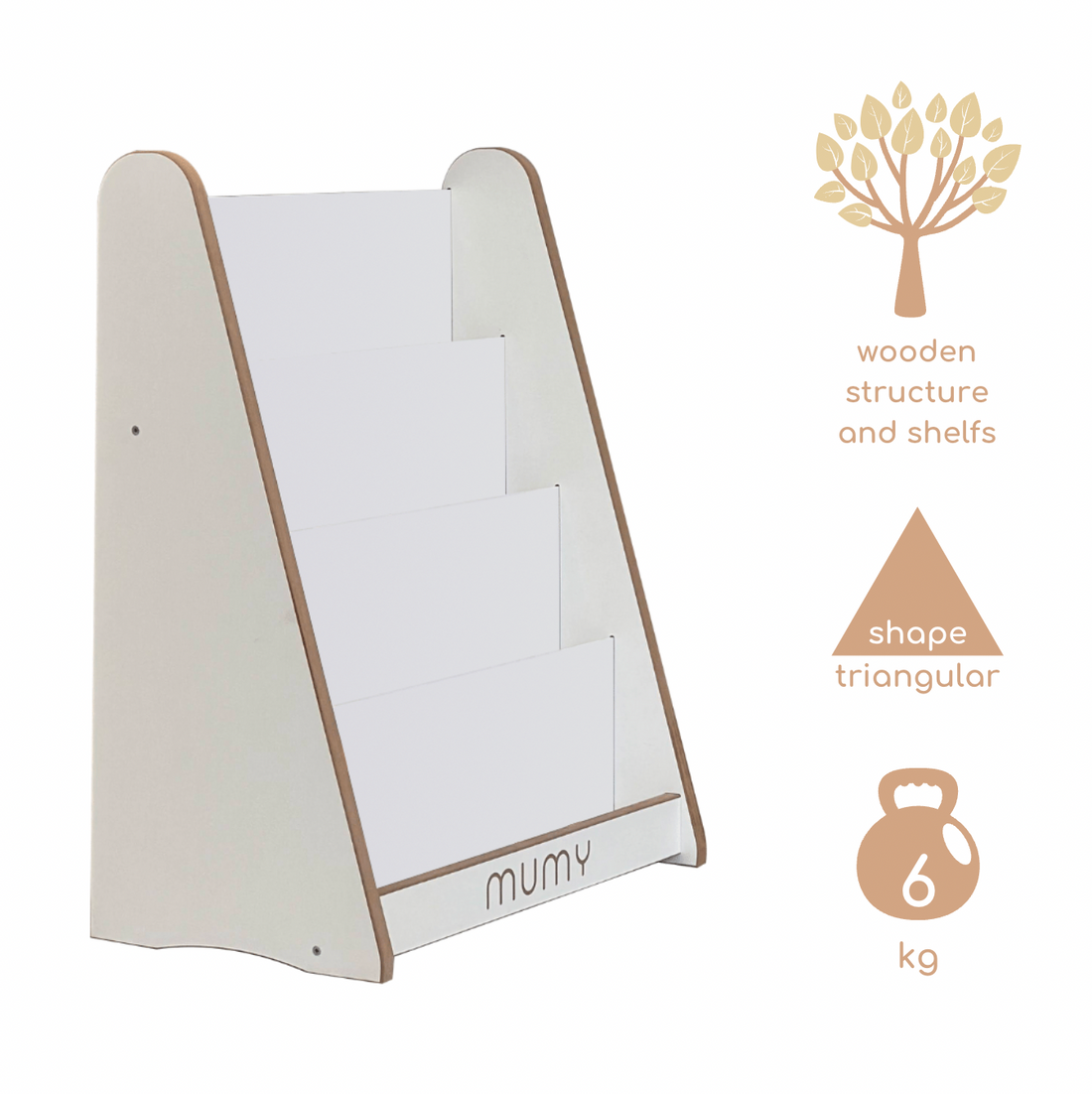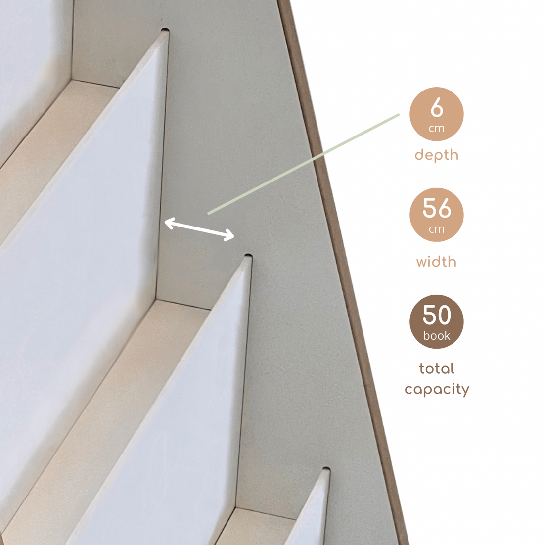 Una libreria pensata per i più piccoli, dal design intelligente e sicuro. La sua forma triangolare autoportante offre ampio spazio per organizzare fino a 50 libri di piccolo formato o circa 30 libri di formato medio, tutti facilmente accessibili per il bambino.