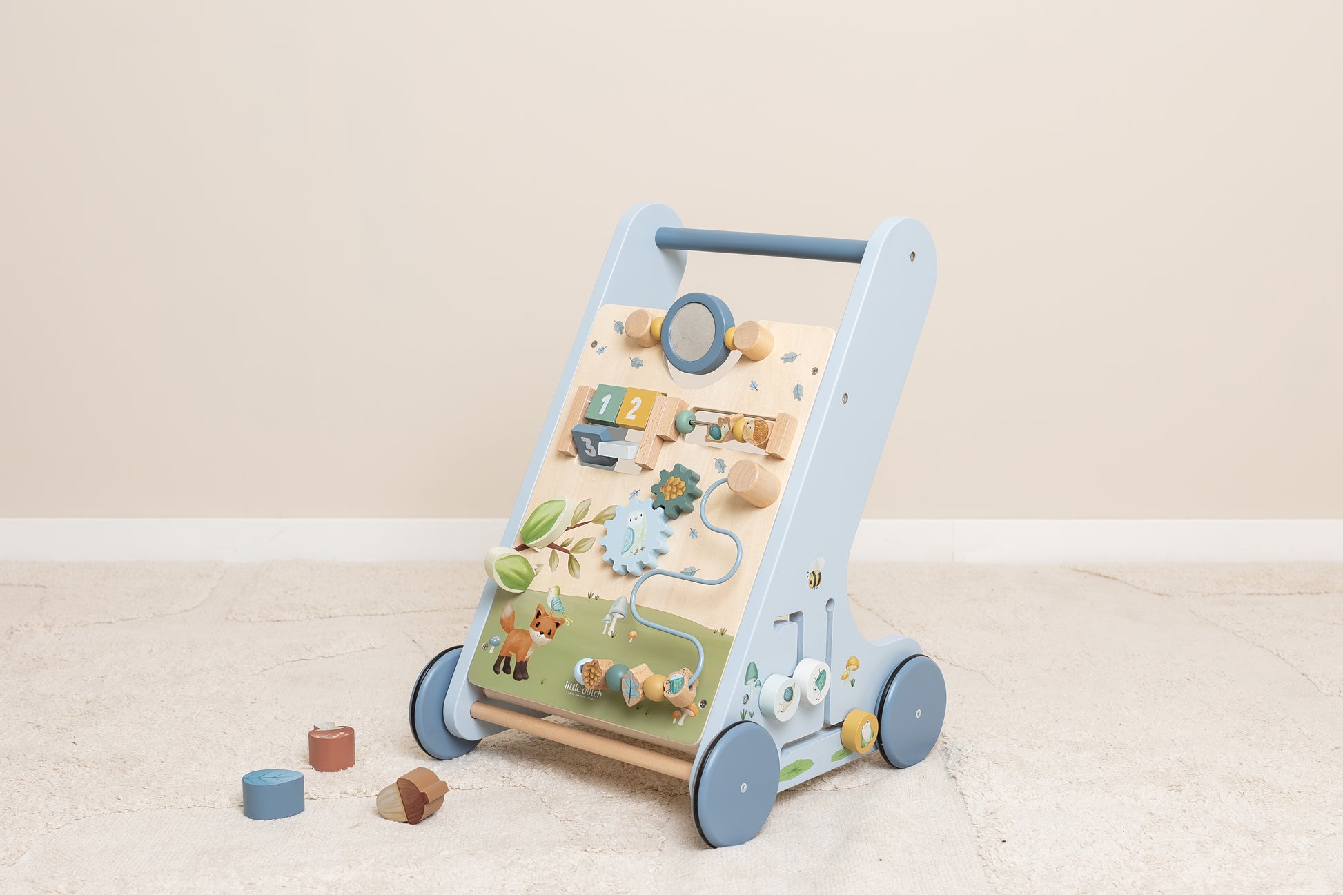 Cammina, gioca e impara! Questo girello multi-attività in legno offre molte attività impegnative per supportare lo sviluppo delle capacità motorie del tuo bambino. Guarda come si riflette la luce se dai un giro allo specchio! Oppure prova a girare la ruota per vedere i piccoli insetti che girano e girano! Sfida il tuo bambino con le numerose attività coinvolgenti di questo girello splendidamente decorato. Ci sono 8 attività da esplorare e padroneggiare. Grazie al design equilibrato il carrello è molto adatto per imparare a camminare per i bambini dai 12 mesi in su che sono quasi pronti a muovere i primi passi. Preparati per degli applausi gioiosi quando il tuo piccolo sfreccia per casa. Le ruote in gomma non lasciano segni sul pavimento e sono sicure per l'uso all'interno.