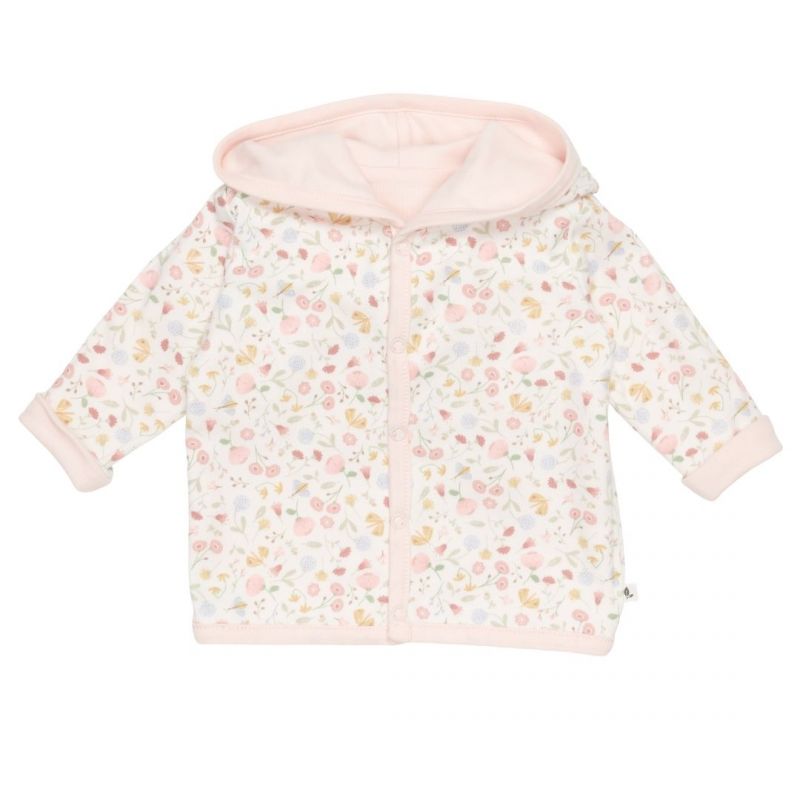 Giacca con cappuccio totalmente reversibile. Un lato è in tinta unita rosa, l'altro lato è impreziosito di stampe di colorati fiori e farfalle. La giacca ha un pratico cappuccio e un'apertura frontale che si allaccia facilmente con cinque bottoni. Realizzata in cotone organico 100% organico certificato.