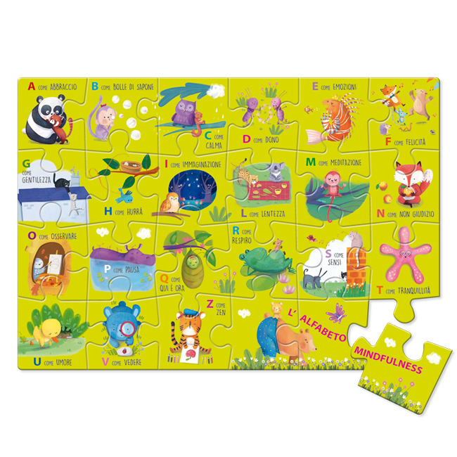 A come Abbraccio – Storie di Mindfulness dalla A alla Z - A come Abbraccio, B come Bolle di sapone, C come Calma… Quante sono le paroline magiche? Un bellissimo libro illustrato che contiene tante storie Mindfulness, per avvicinare i bambini alla pratica della consapevolezza nelle piccole e grandi esperienze della vita quotidiana. Nella scatola trovi il libro, il puzzle dell’alfabeto, per divertirsi a ricomporre il grande alfabetiere della Mindfulness!