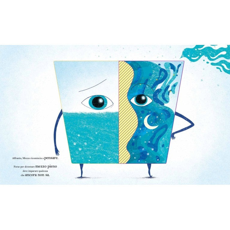 Mezzo è un piccolo bicchiere d’acqua che si sente mezzo vuoto. Per sentirsi mezzo pieno le prova tutte: nuota balla, studia, si allena… ma nulla da fare. Forse ha qualcosa che non va? Perché si vede sempre “a metà”?