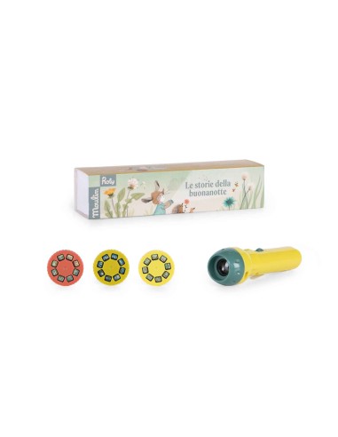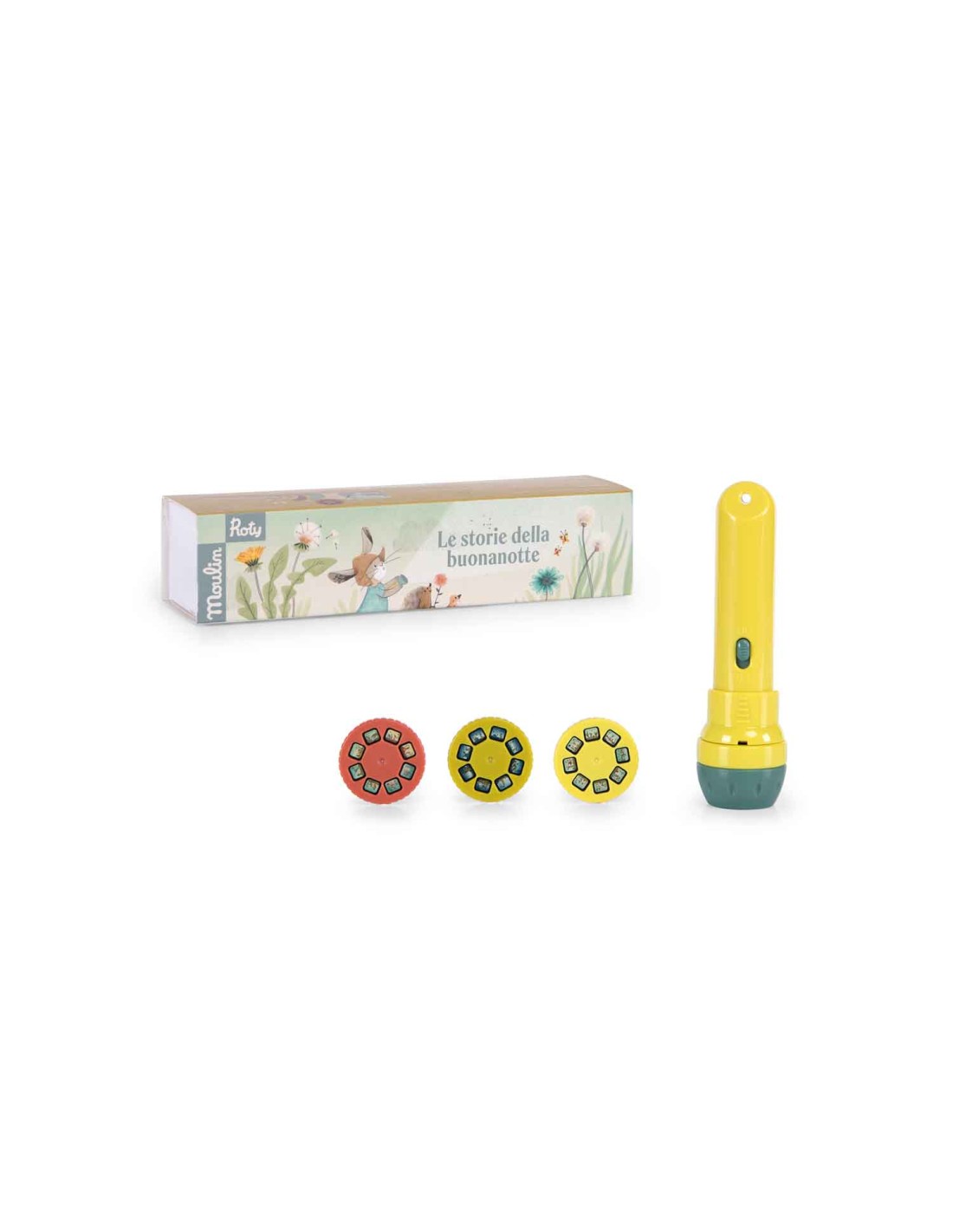 Sogna e crea con la Torcia Proietta Storie della Buonanotte di Moulin Roty! Un divertente gioco di luci come le diapositive di una volta, per raccontare l'avventura di "I 3 Coniglietti" e far viaggiare la fantasia dei bimbi prima di addormentarsi. Cambia storie, inventa storie e sogna: monta tre dischi con diverse immagini e vivi una magica avventura!