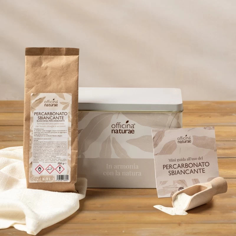 Porta nella tua routine di bucato con il Kit Scatola in Latta con Percarbonato Sbiancante Officina Naturae. Questa confezione regalo è pensata per chi desidera avere sempre una biancheria candida e splendente.