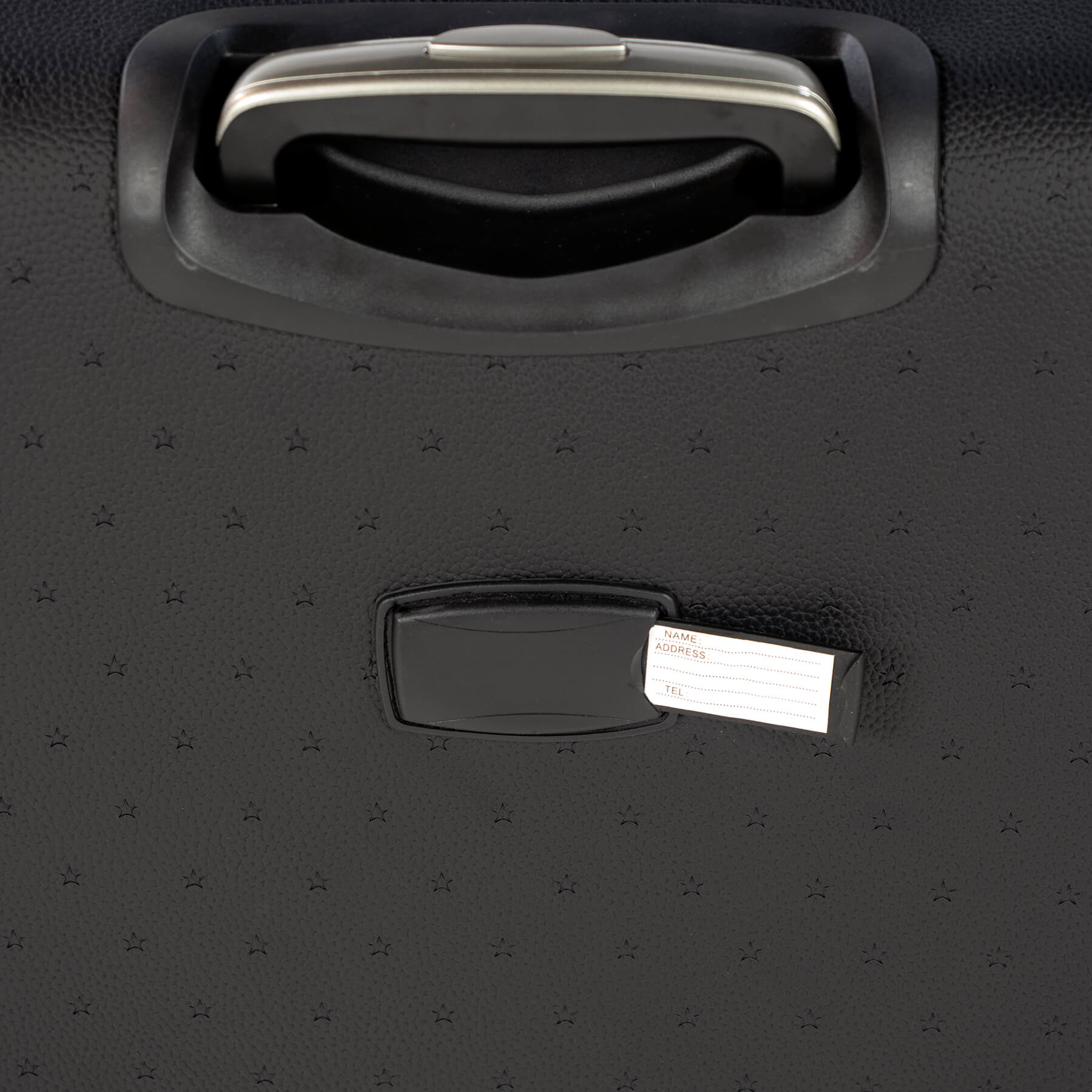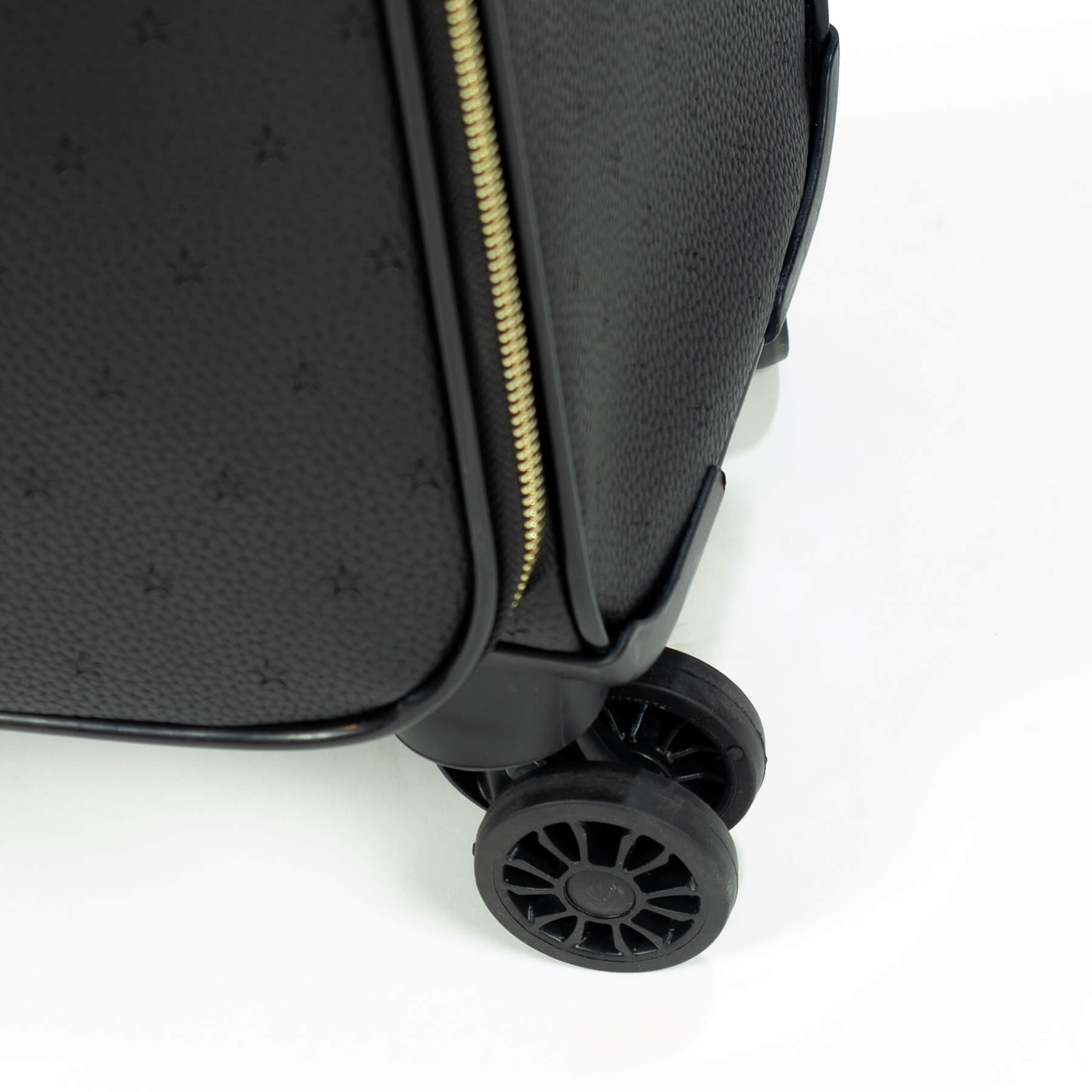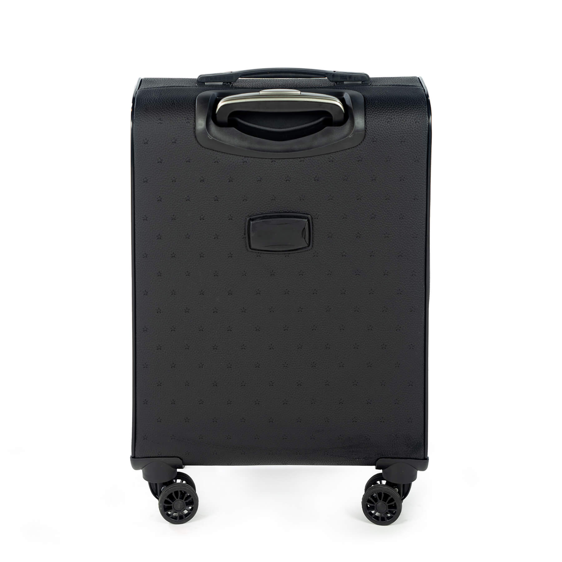 Questa valigia da cabina in ecopelle nera con stelle incise è perfetta per i tuoi viaggi. Le ruote multidirezionali garantiscono un comodo movimento, mentre lo scomparto interno con elastici e la tasca con cerniera assicurano un'organizzazione impeccabile. Il manico telescopico e la tasca esterna con cerniera aggiungono funzionalità. Materiali sicuri e di alta qualità. Dimensioni: 35,5x45x21 cm.
