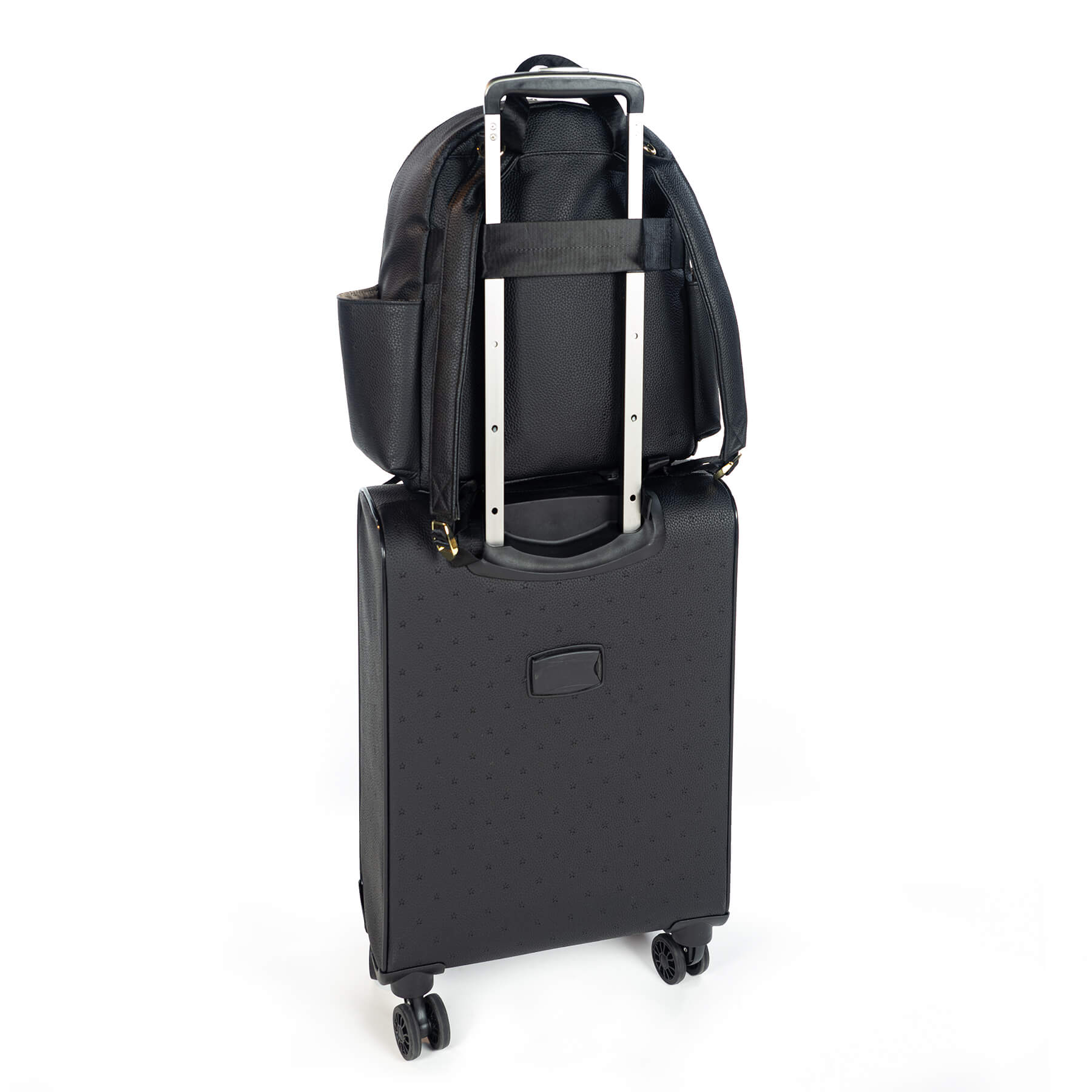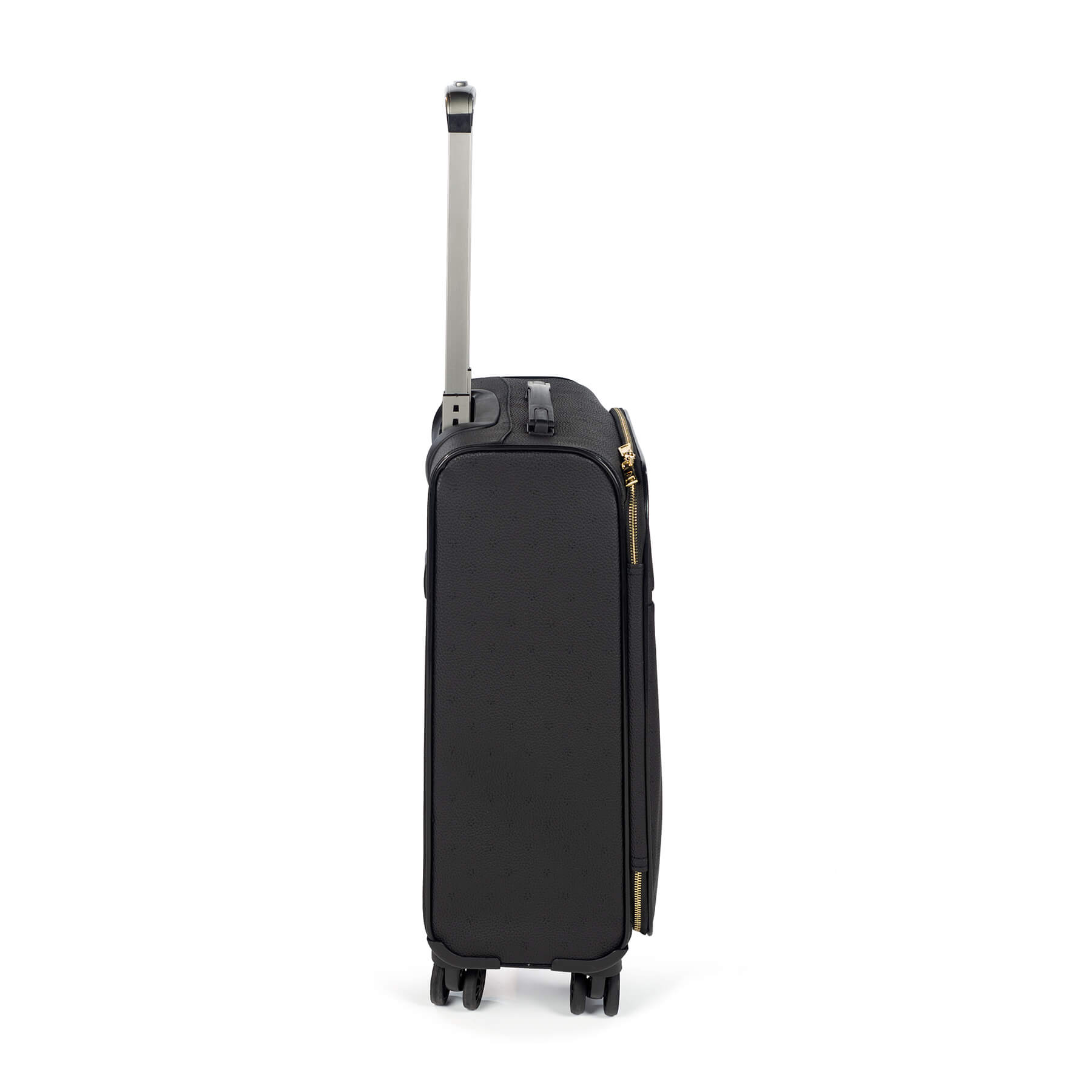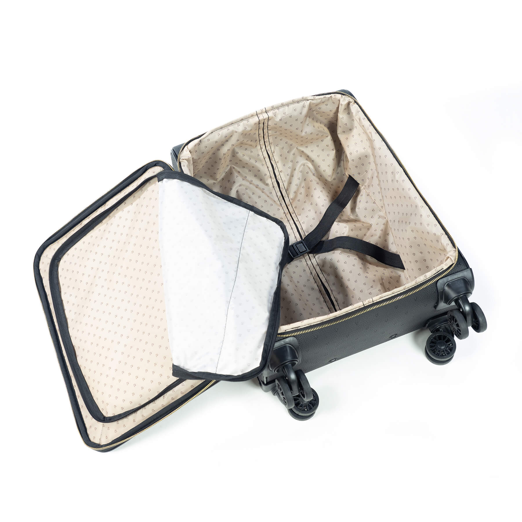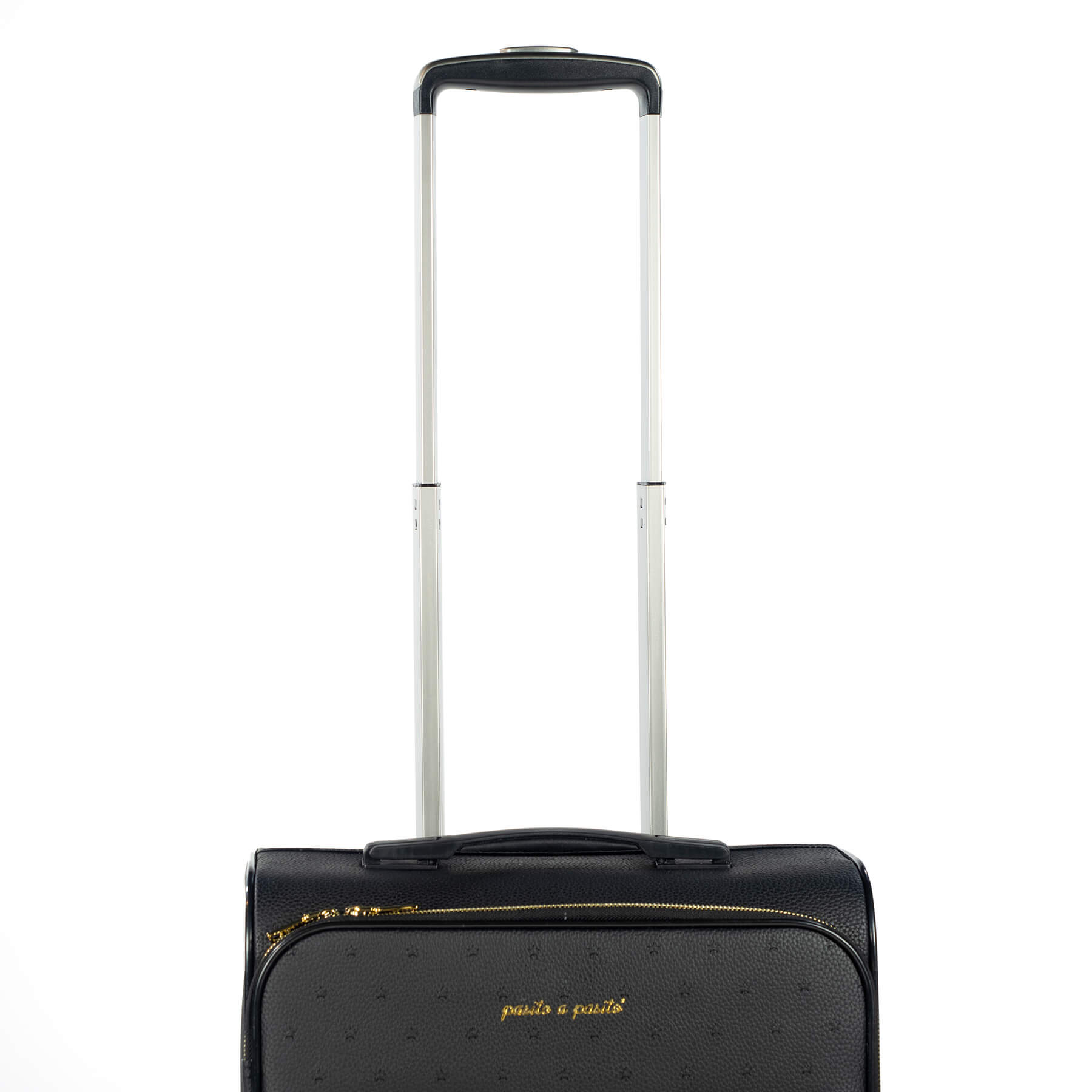 Questa valigia da cabina in ecopelle nera con stelle incise è perfetta per i tuoi viaggi. Le ruote multidirezionali garantiscono un comodo movimento, mentre lo scomparto interno con elastici e la tasca con cerniera assicurano un'organizzazione impeccabile. Il manico telescopico e la tasca esterna con cerniera aggiungono funzionalità. Materiali sicuri e di alta qualità. Dimensioni: 35,5x45x21 cm.