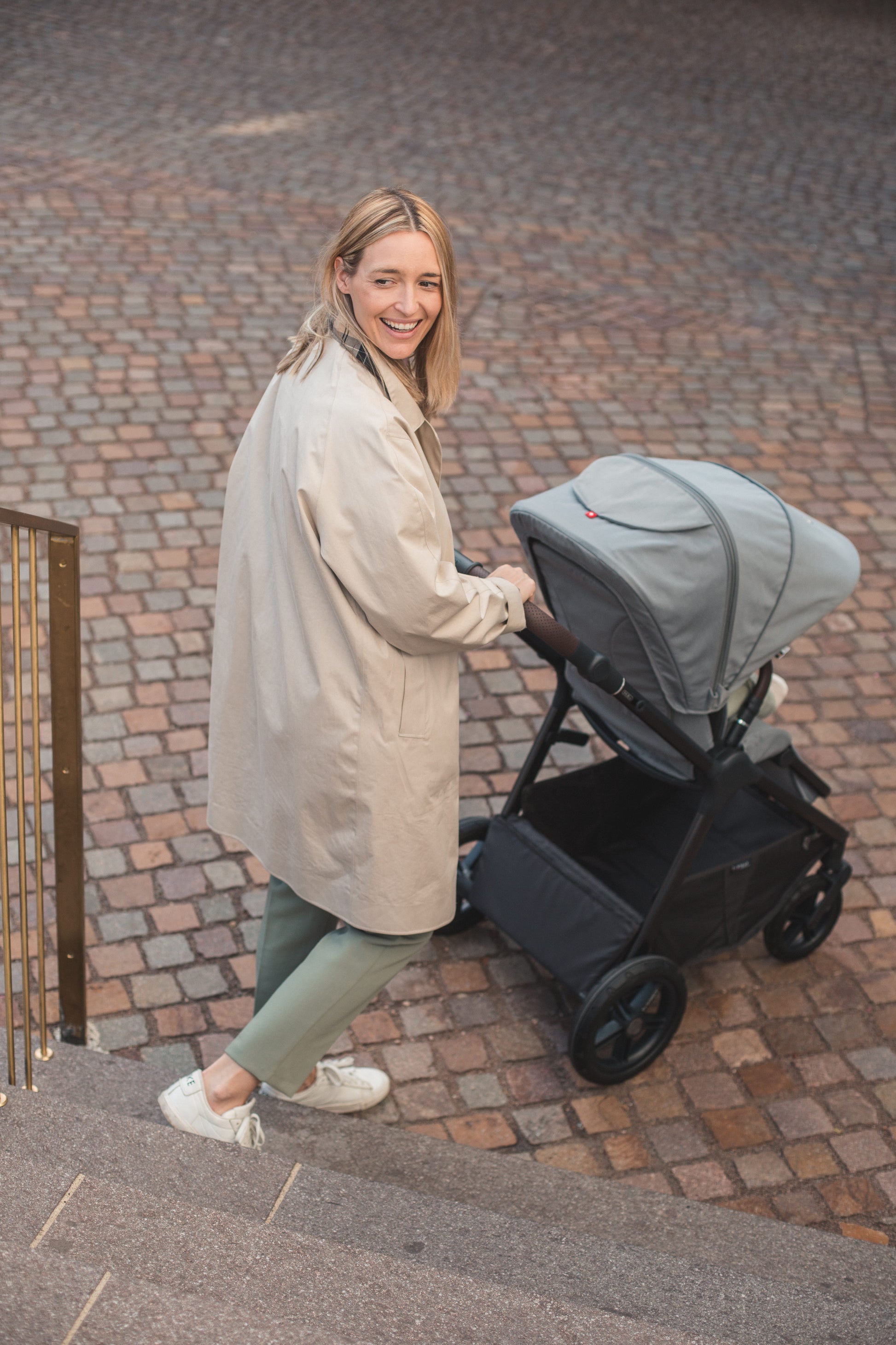 Il telaio leggero in alluminio e le sospensioni sulle quattro ruote del passeggino M.5x assicurano sempre un’ottima manovrabilità e una guida ottimale.