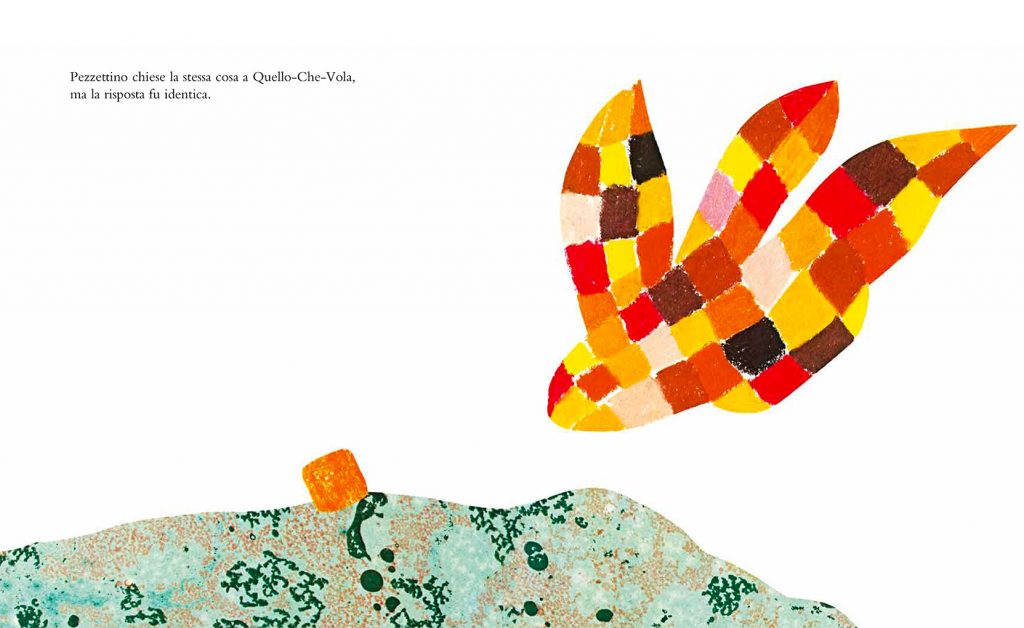 Pezzettino è talmente piccolo in confronto ai suoi amici che si convince di essere un pezzetto di qualcun altro, un pezzetto mancante. Ma di chi? Decide così di partire per scoprirlo: domanda invano a Quello-Che-Corre, a Quello-Forte, a Quello-Che-Nuota, a Quello-Che-Vive-Sulle-Montagne e a Quello-Che-Vola. Quello-Saggio, infine, gli suggerisce di andare all’isola Chi-Sono, dove finalmente scopre la sua vera identità e si tratta di una bellissima sorpresa…