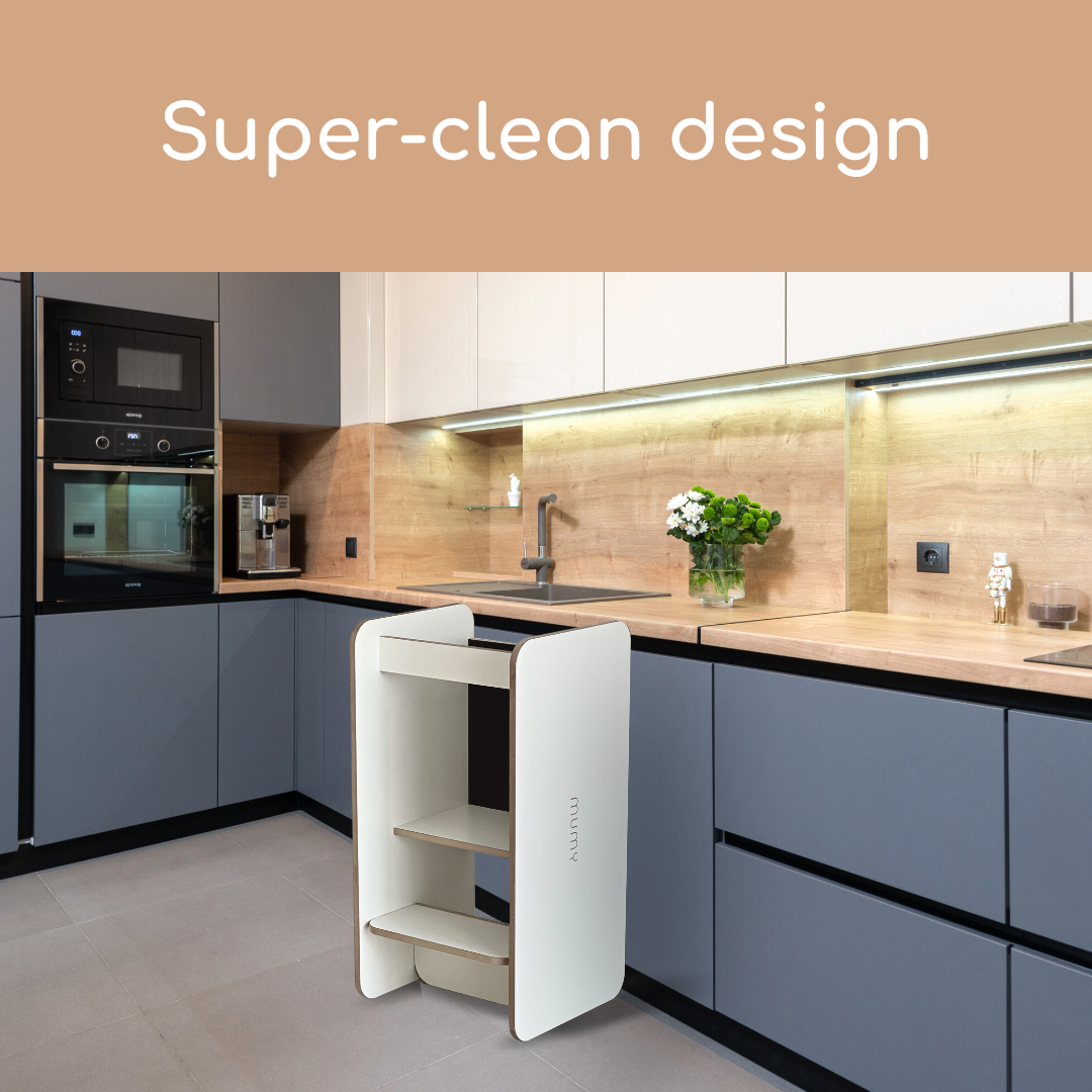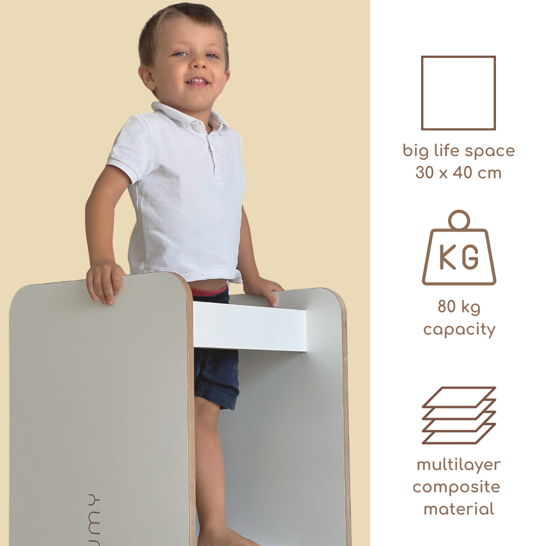 Progettata per accompagnare il bambino nelle sue prime esperienze di autonomia, questa torre offre un ampio spazio vivibile, protezioni su tre lati e si trasforma facilmente in tavolino con scrivania.