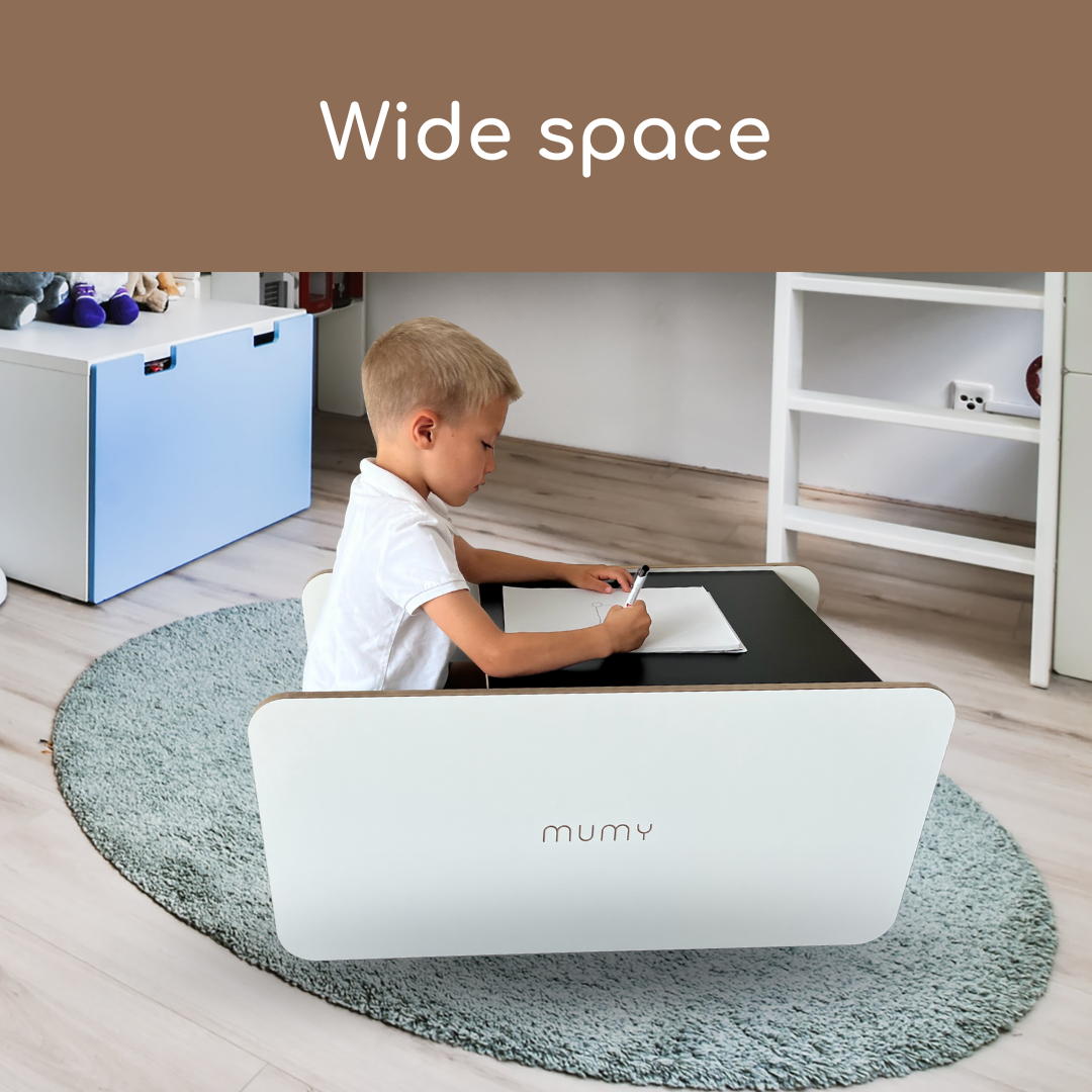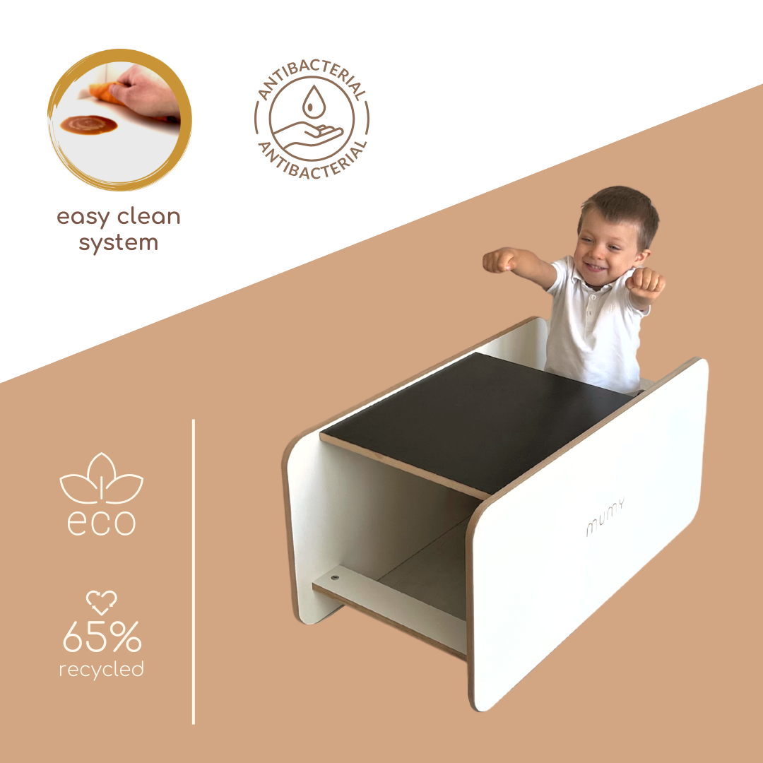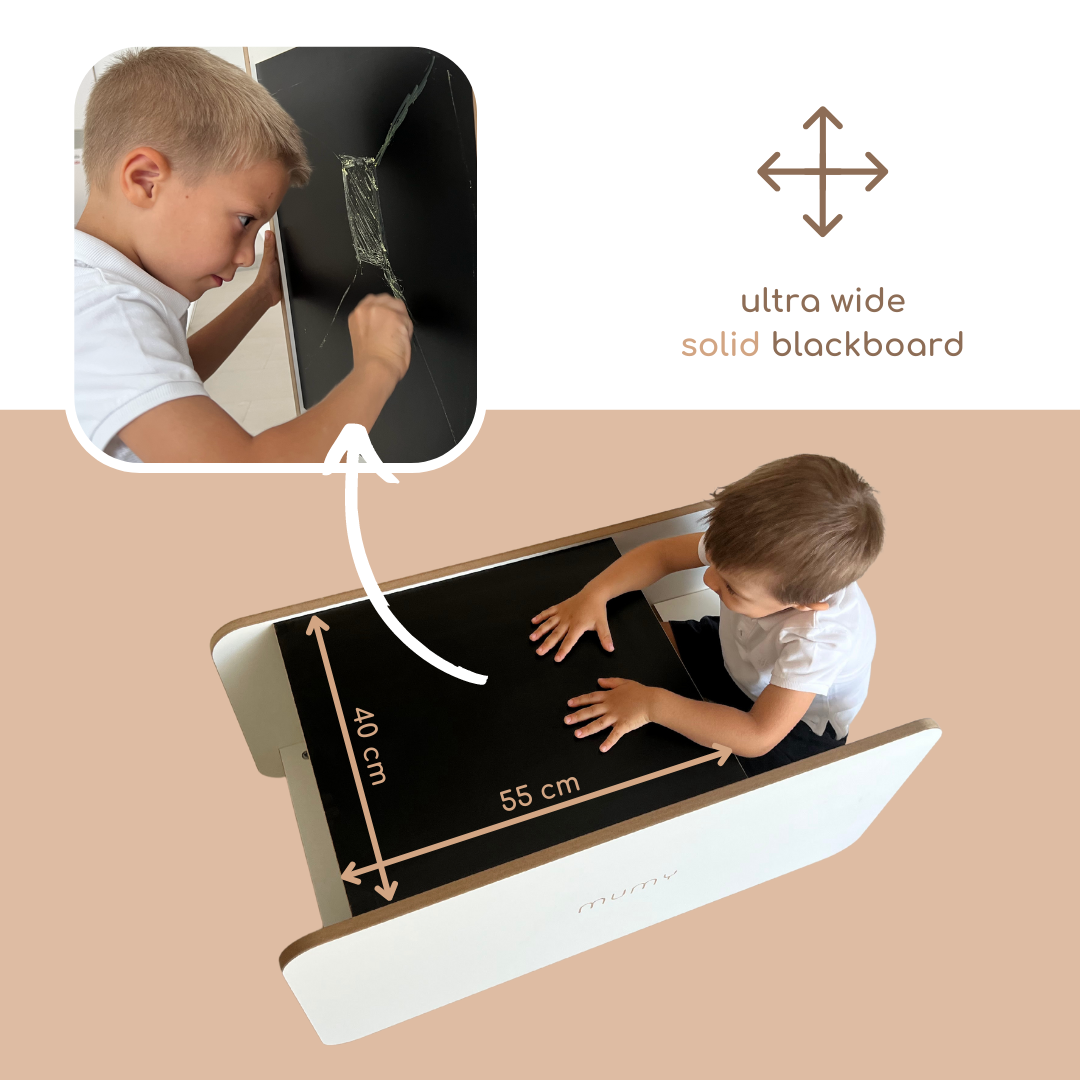 La superficie della scrivania è rivestita con materiale effetto lavagna: un invito aperto alla creatività, dove il bambino può disegnare, scrivere e sperimentare liberamente con i gessetti.