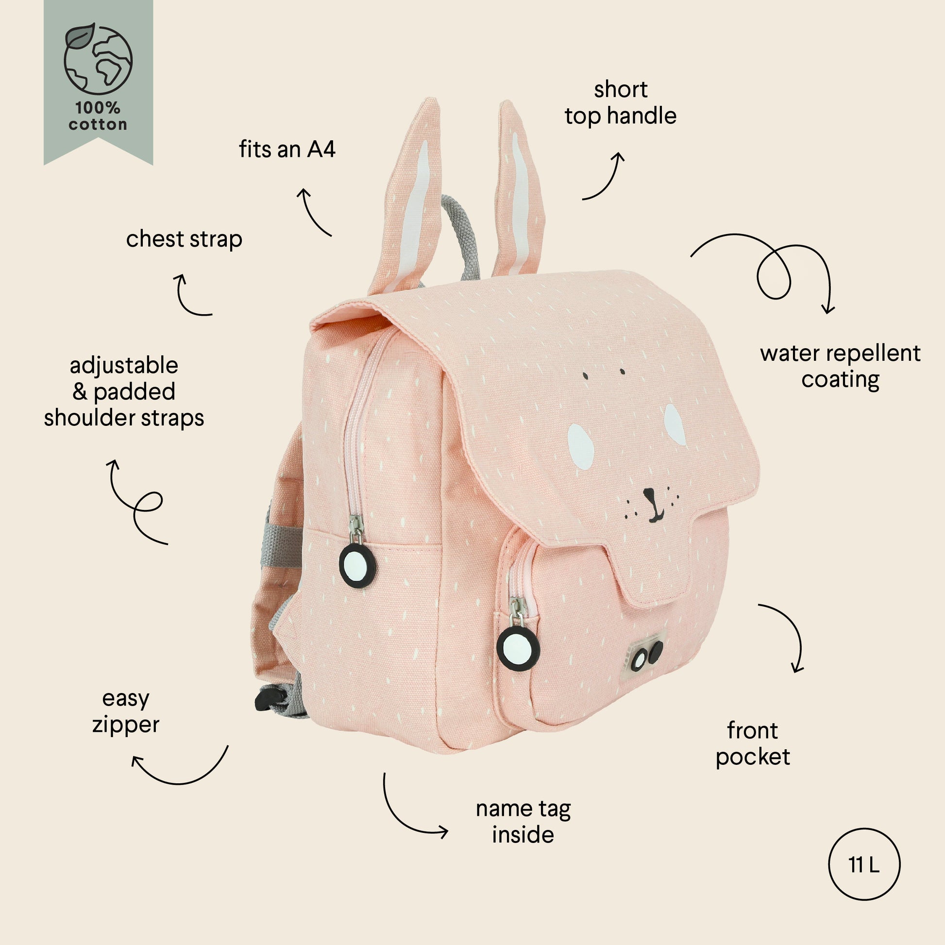 Porta tutto con stile con la Cartella Trixie - Mrs. Rabbit! Realizzata con spallacci regolabili e imbottiti per il massimo comfort, dispone di una maniglia sulla parte superiore per appenderla facilmente e una fibbia sul petto per mantenere gli spallacci in posizione. Con una tasca sul davanti e cerniere con tiretto, è anche personalizzabile con una targhetta interna per scrivere il nome del bambino.
