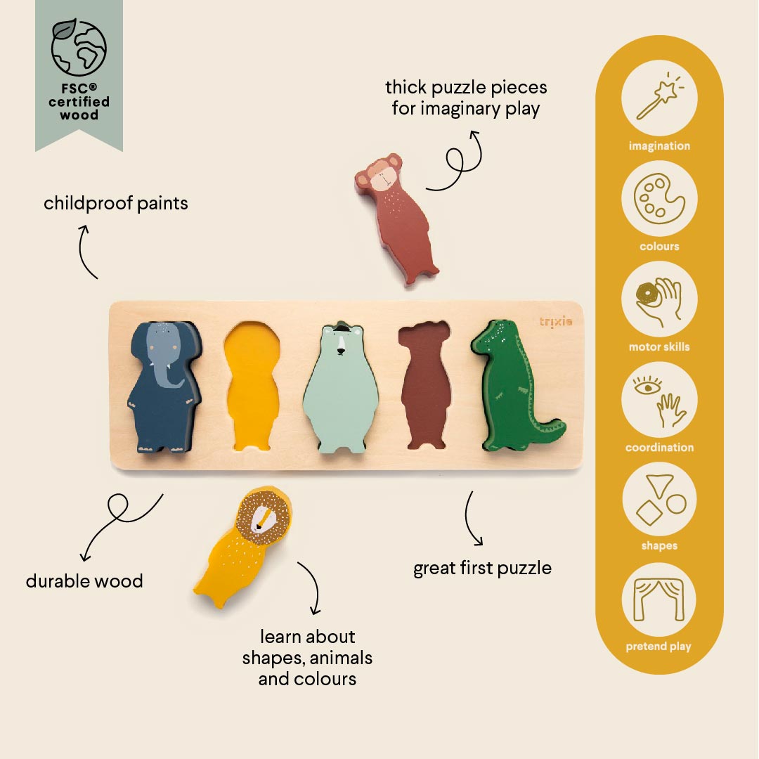 Scopri il mondo degli animali con Trixie - Puzzle di legno a forma di animali. Metti ogni pezzo al suo posto per conoscere gli animali e migliorare la capacità motoria. I pezzi sono spessi e facili da maneggiare per i più piccoli e possono stare in piedi da soli, stimolando l'apprendimento dei colori e degli animali e sviluppando la fantasia. Rimuovi l'animale per scoprire il suo colore!
