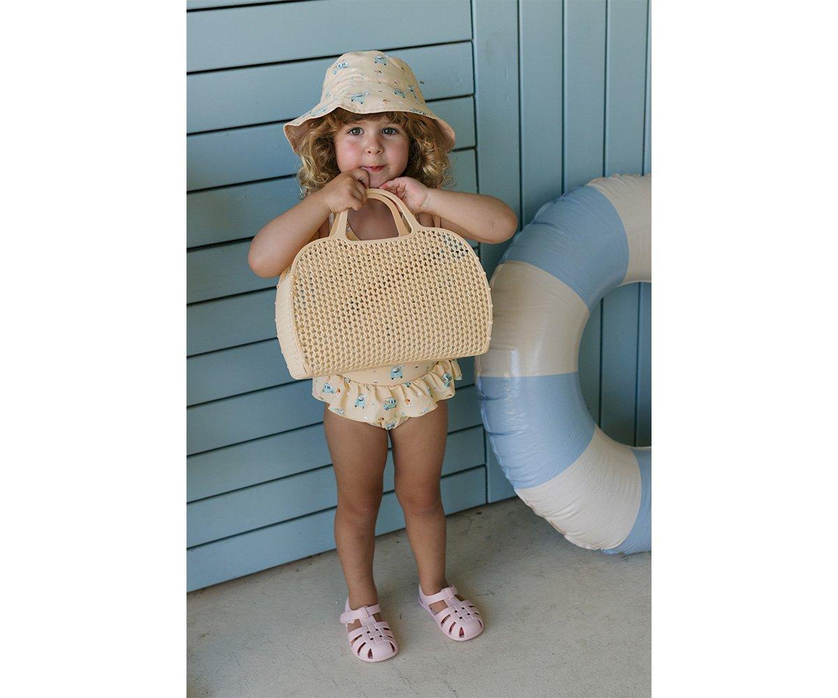 Borsone spiaggia con fondo a rete per far cadere i resti di sabbia che si depositano fastidiosamente nelle borse normali e per ventilare asciugamani e cose umide.