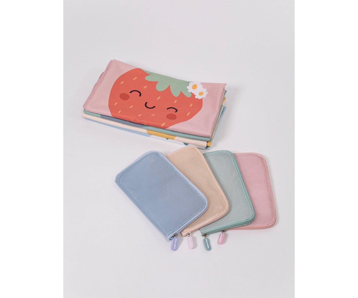 Borsone spiaggia con fondo a rete per far cadere i resti di sabbia che si depositano fastidiosamente nelle borse normali e per ventilare asciugamani e cose umide.